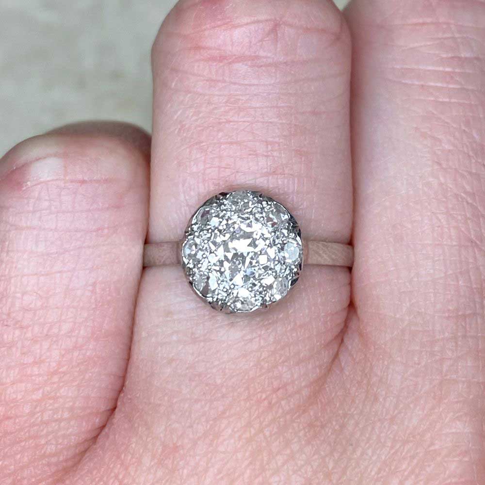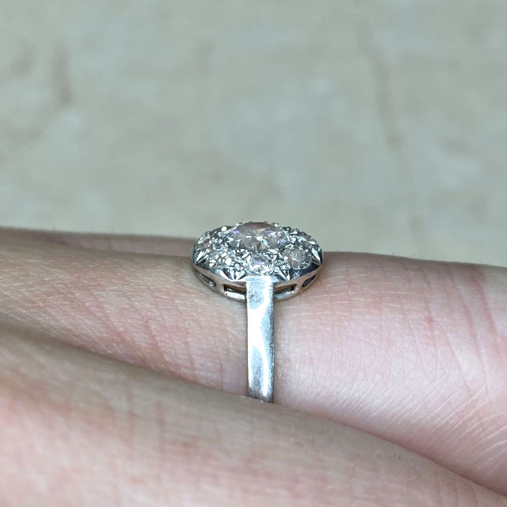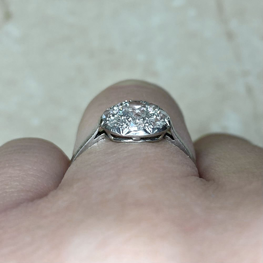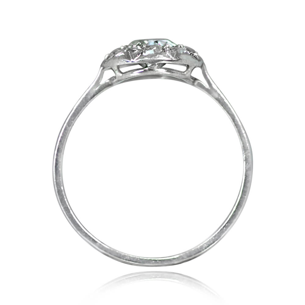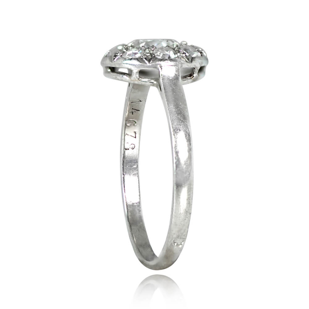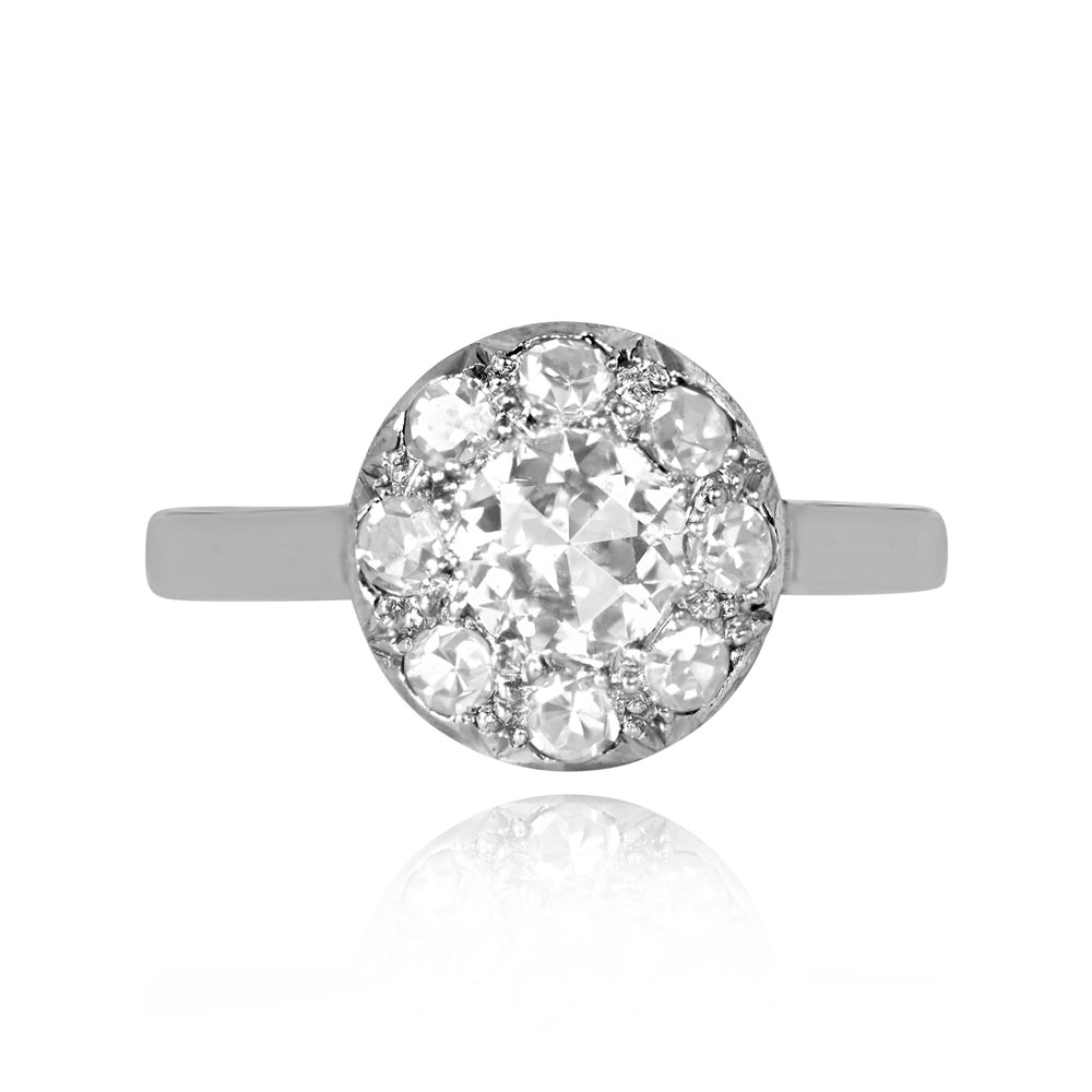 This Art Deco diamond cluster engagement ring centers an old European cut diamond weighing approximately 0.50 carats, H color and SI1 clarity. The center stone is surrounded by single cut diamonds. The total diamond weight of this ring is 0.80 carats, H-I color and VS2-SI1 clarity overall. This antique ring was handcrafted in platinum circa 1925, and bears French hallmarks.