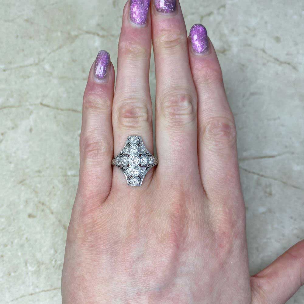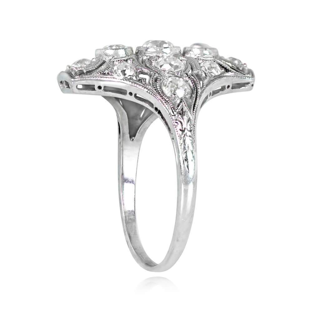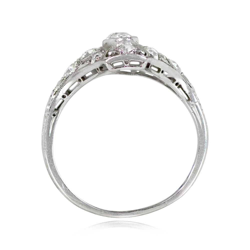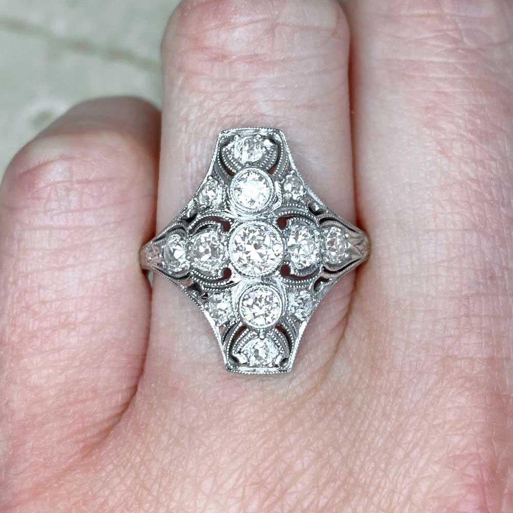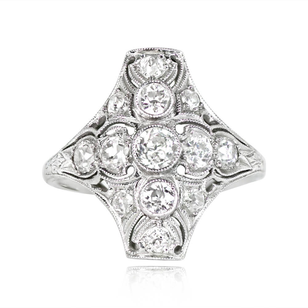 An antique elongated ring featuring three bezel-set old European cut diamonds with a total approximate weight of 0.40 carats, set in a north-south orientation. Four old European cut diamonds are set east-west along the shoulders, followed by hand engravings. The openwork filigree mounting is decorated with single cut diamonds and fine milgrain. The diamonds are H color and VS1-VS2 clarity overall. The total weight of the additional diamonds is approximately 0.58 carats. This ring was handcrafted in platinum during the Art Deco era, circa 1920.