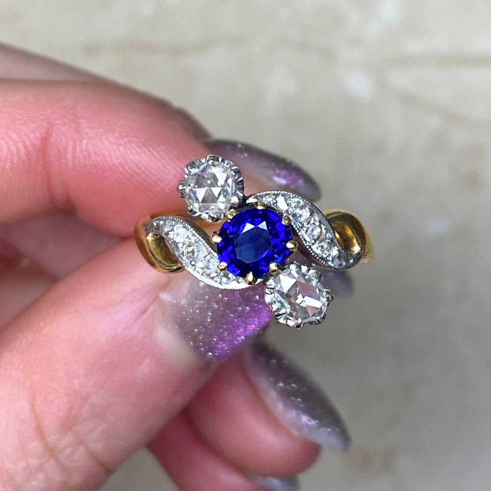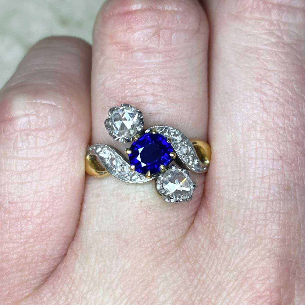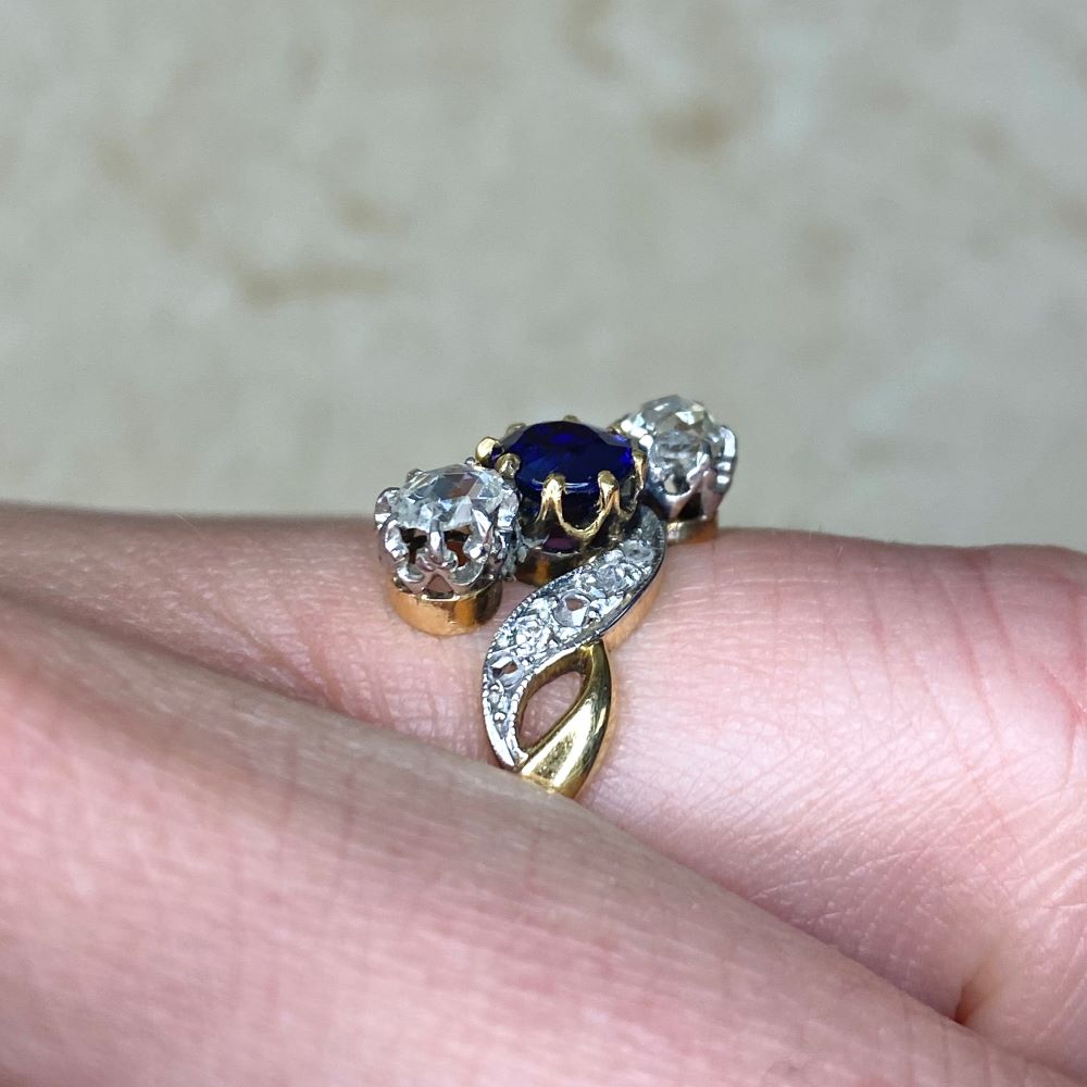 An original ring from the Edwardian era featuring three stones prong-set on an angle. The center natural sapphire weighs approximately 0.80 carats. The two diamonds on each side weigh approximately 0.40 carats, J color, VS2-SI1 overall. This ring was made in France, Platinum on 18k yellow gold.