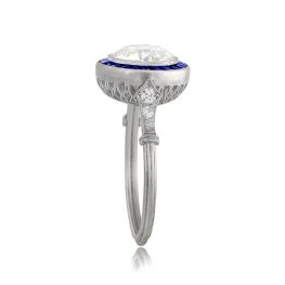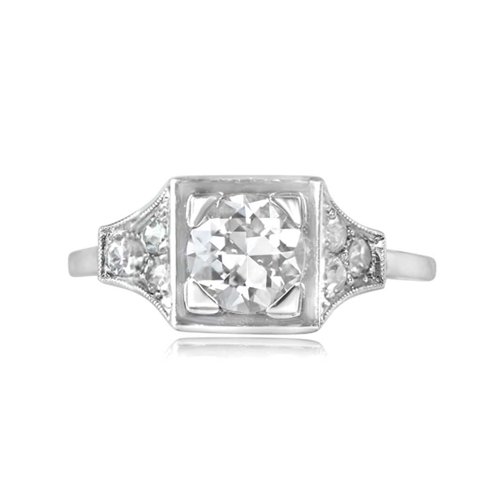 An antique engagement ring featuring a 0.70 carat old European cut diamond, H color and SI1 clarity, set in box prongs. The tapered shoulders are set with approximately 0.09 carats of single cut diamonds and decorated with fine milgrain. The mounting is platinum and bears French hallmarks. This ring was handcrafted during the Art Deco era, circa 1920.