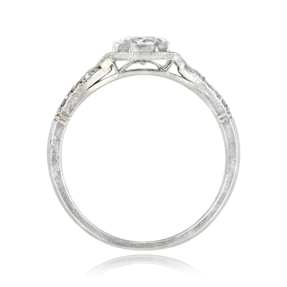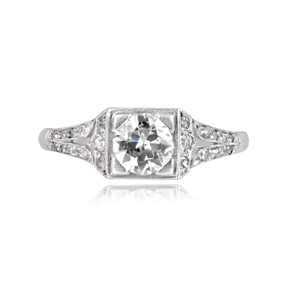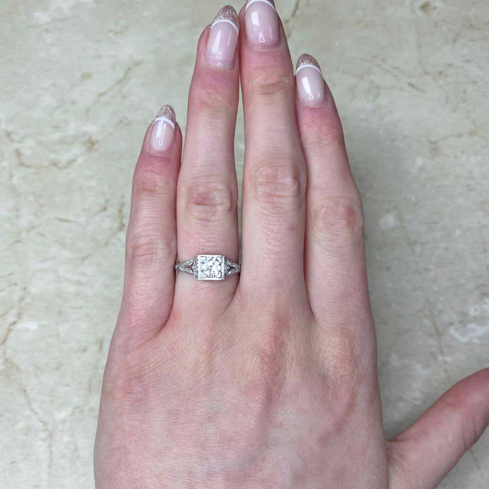 A fine French antique engagement ring featuring a 0.60-carat old European cut diamond, I color, SI2 clarity. The center is set in box prongs surrounded by a geometric square bezel. Single-cut diamonds are set along the shoulders. This ring is from the Art Deco era and was made in France circa 1920.