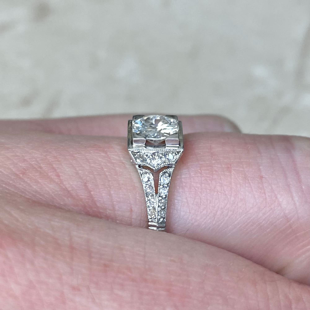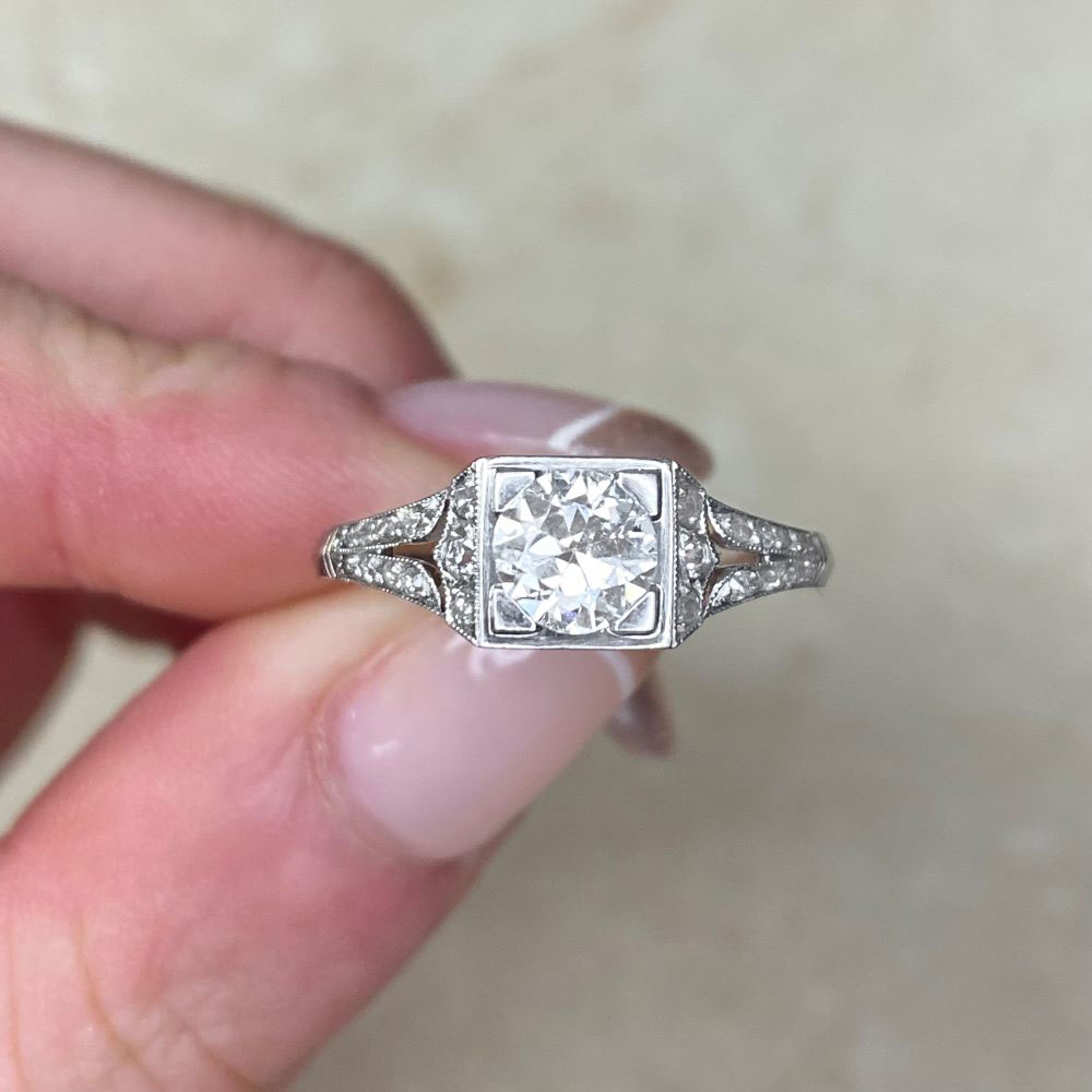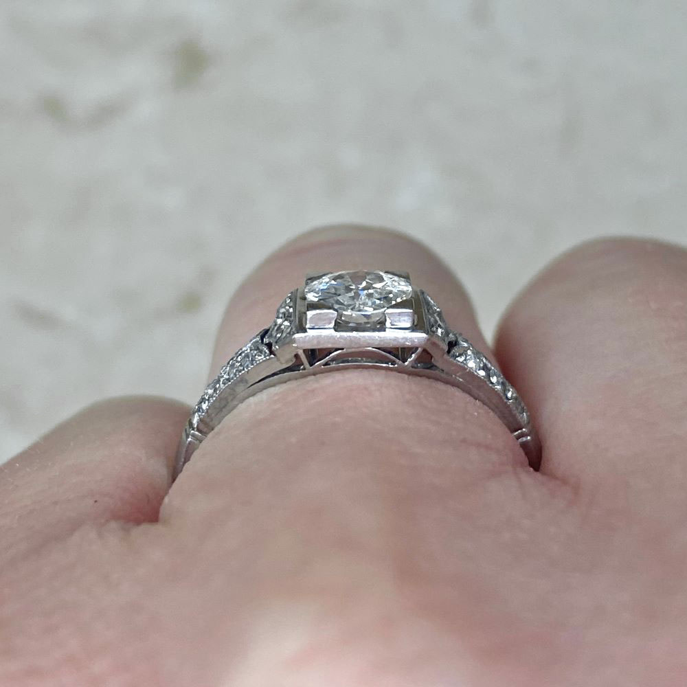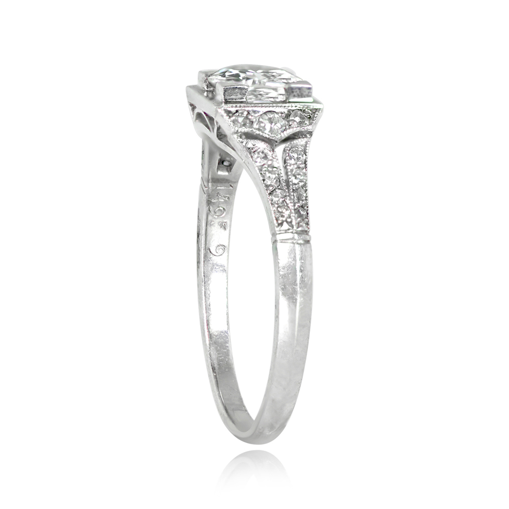 A fine French antique engagement ring featuring a 0.60-carat old European cut diamond, I color, SI2 clarity. The center is set in box prongs surrounded by a geometric square bezel. Single-cut diamonds are set along the shoulders. This ring is from the Art Deco era and was made in France circa 1920.