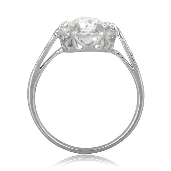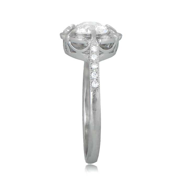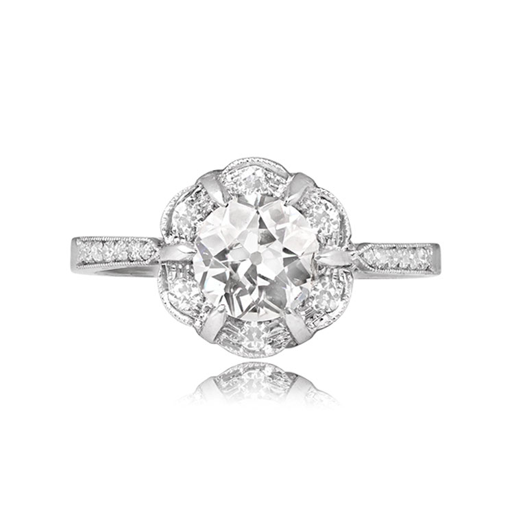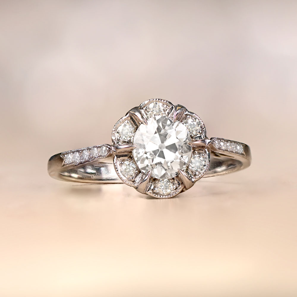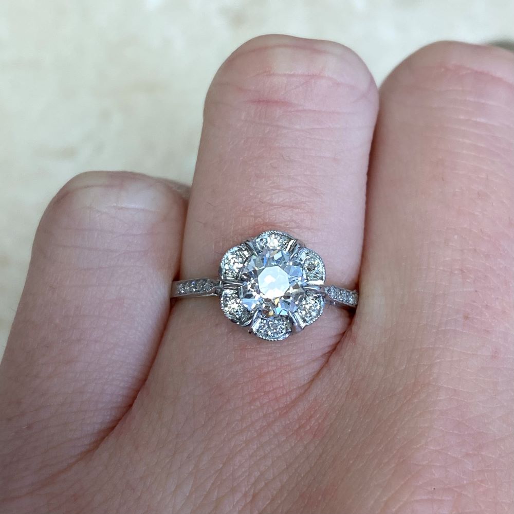 A stunning Art Deco style ring handcrafted in platinum. This ring features a lively old European cut diamond weighing approximately 0.92 carats and set in prongs. Surrounding the center diamond is a cluster of old European cut diamonds. Additional old European cut diamonds are pave-set along the shoulders.