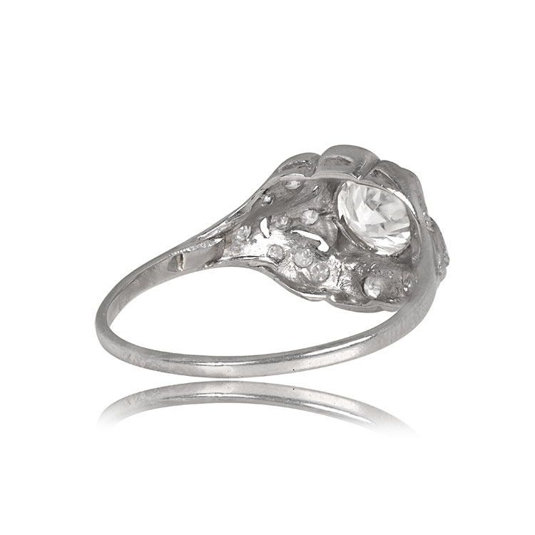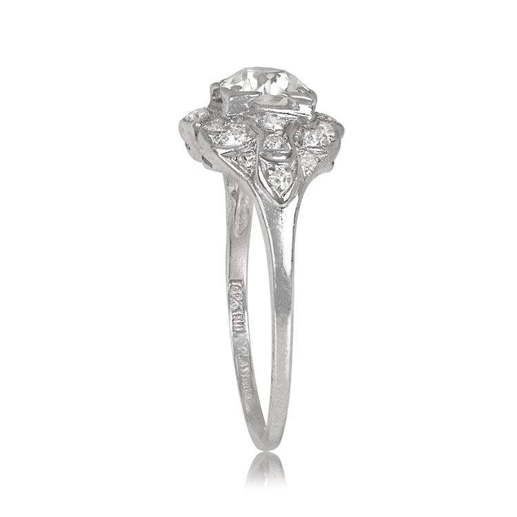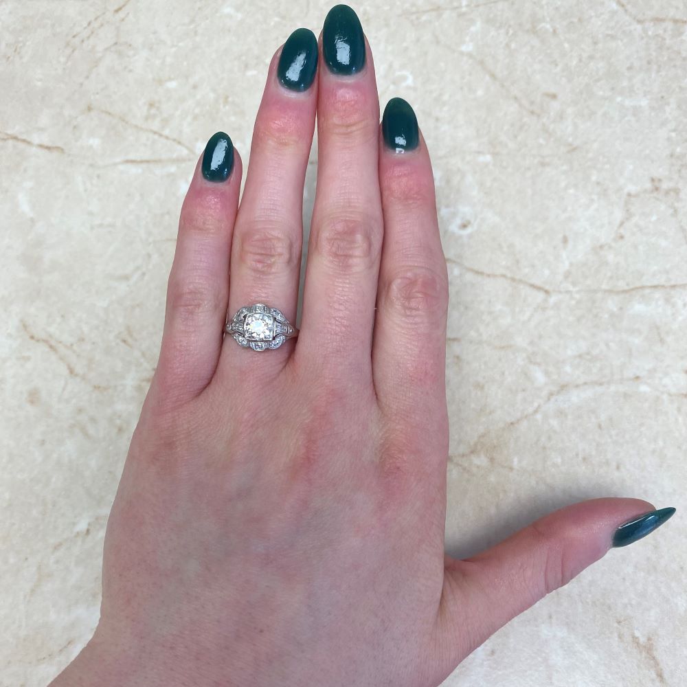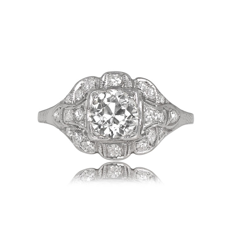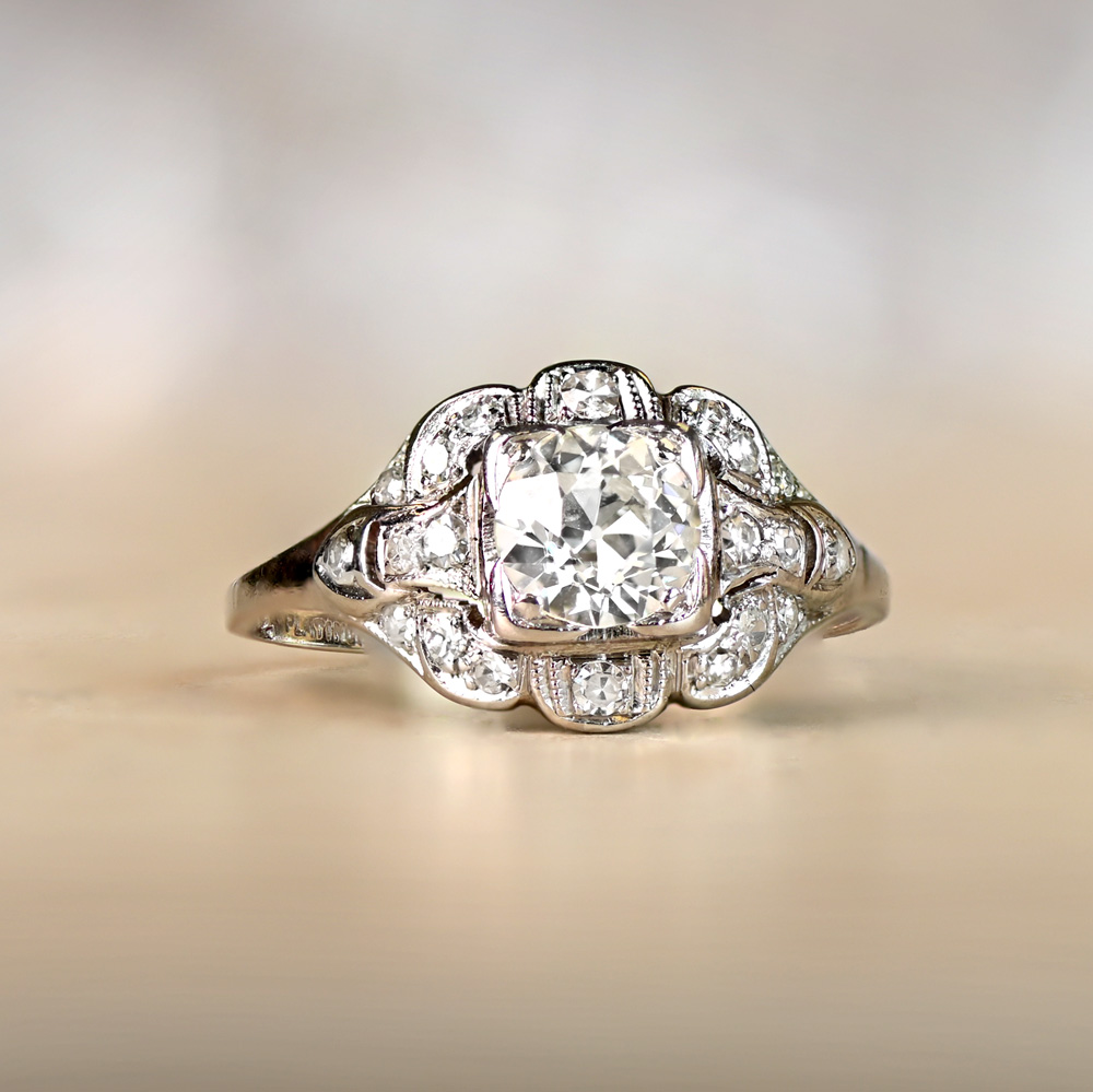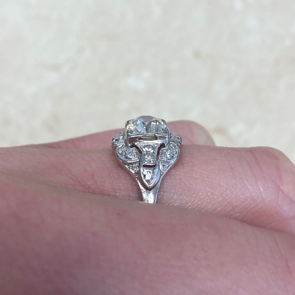 An original Art Deco engagement ring featuring an old European cut diamond weighing approximately 0.90 carats, J color and VS2 clarity. This vintage ring showcases a halo of single cut diamonds surrounding the center stone and along the shoulders. The weight of the additional diamonds is approximately 0.30 carats total. This vintage ring was handcrafted in platinum circa 1930.