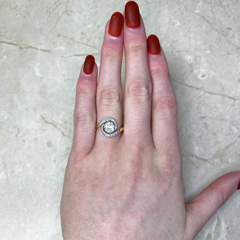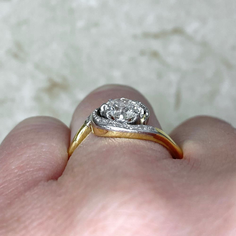 An antique ring that centers an approximately 0.89-carat old European cut diamond, I color and VS2 clarity, set in prongs. A ribbon motif pave-set with rose-cut diamonds decorated with fine milgrain swirls around the center diamond to create a halo. This ring was handcrafted during the Edwardian era, circa 1900, and is platinum on 18k yellow gold.