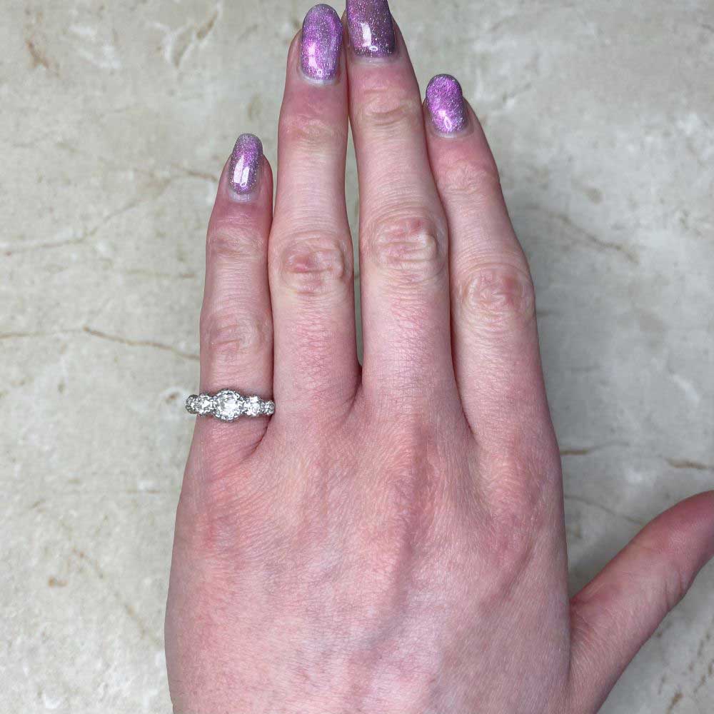 The center diamond weighs approximately 0.45 carats, I color, VS2. The total approximate diamond weight of this ring is 0.90 carats.