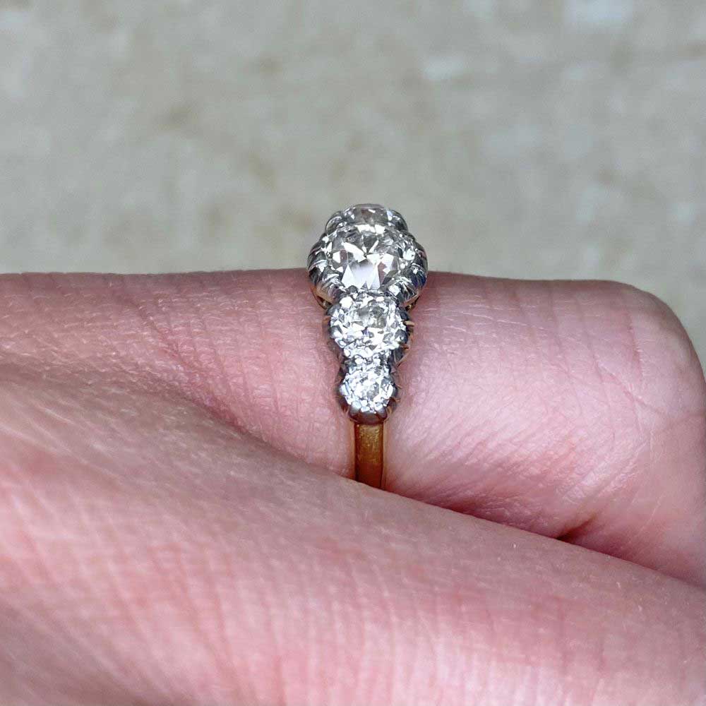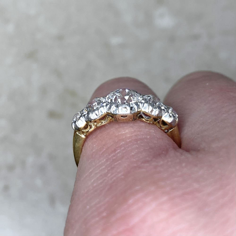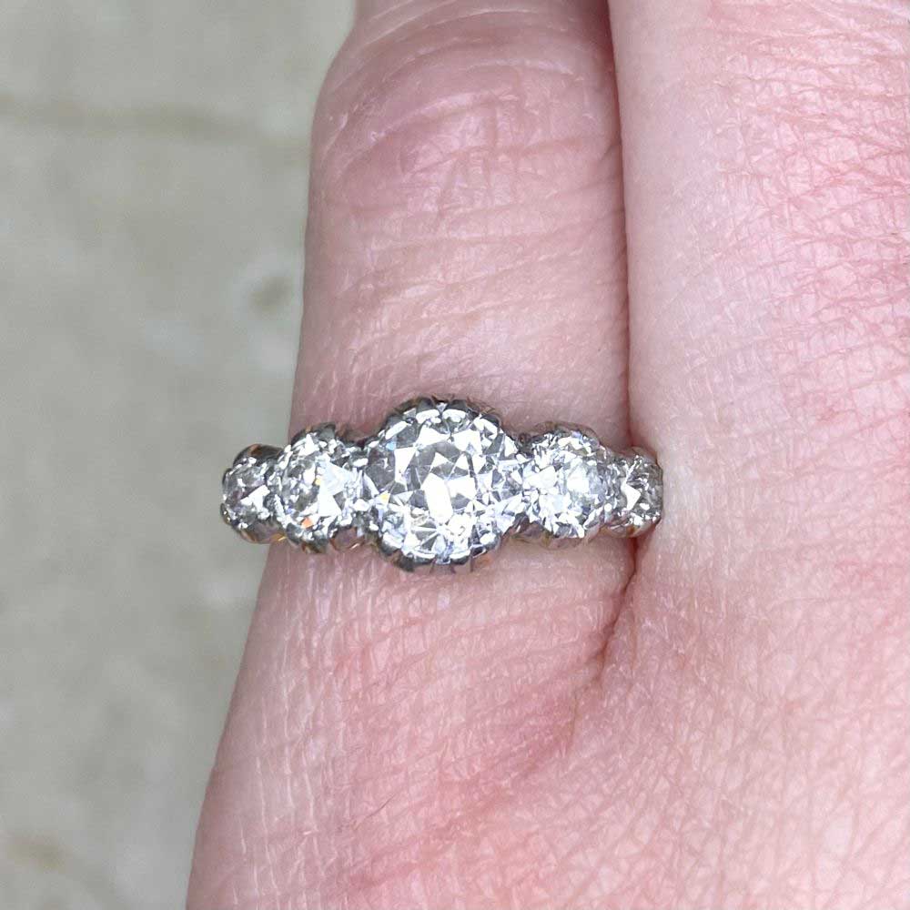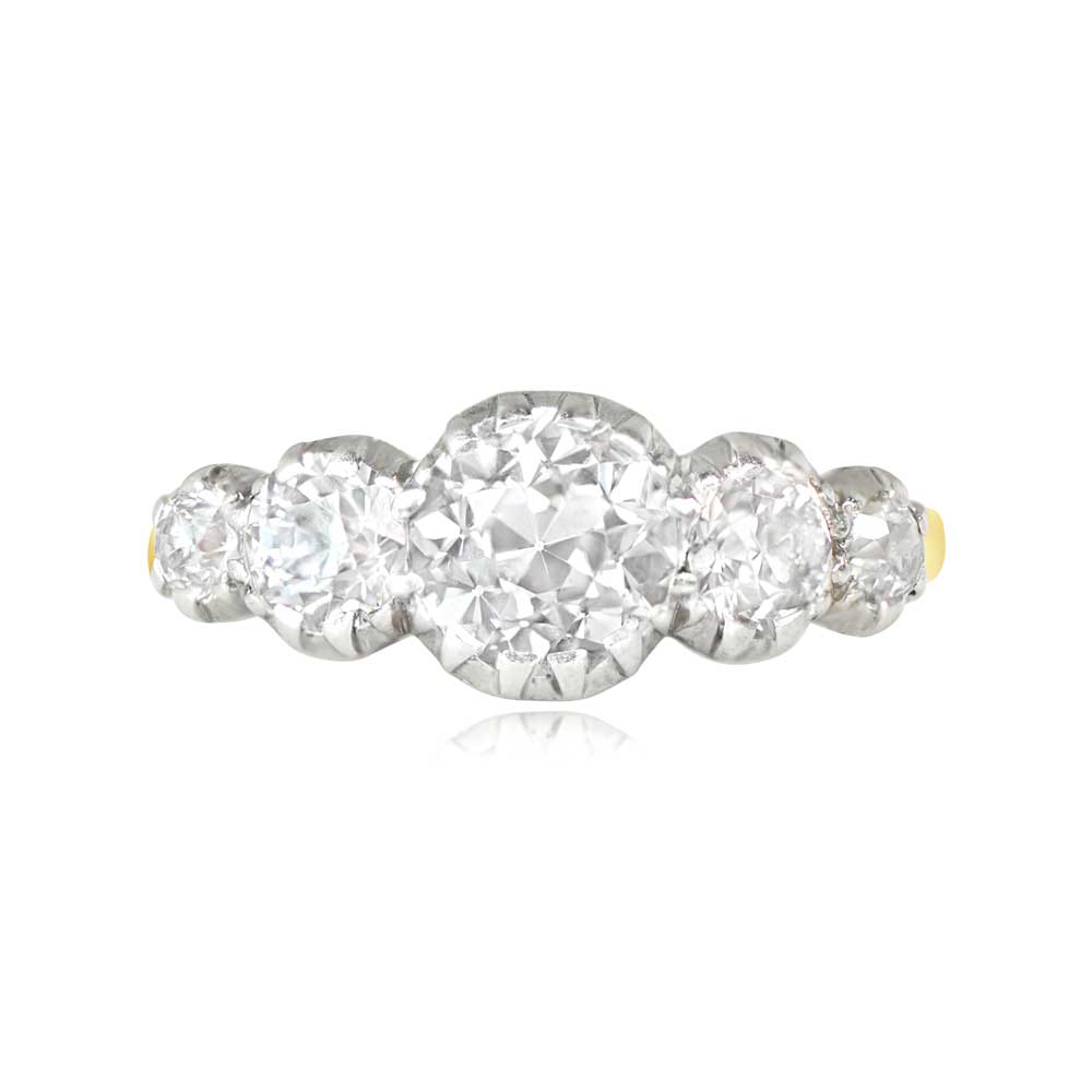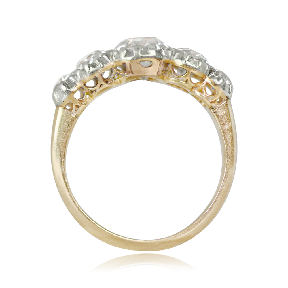 A stunning antique ring featuring five old European cut diamonds half-bezel set in platinum. This ring is platinum on 18k yellow gold and was made in the Edwardian era, circa 1900.