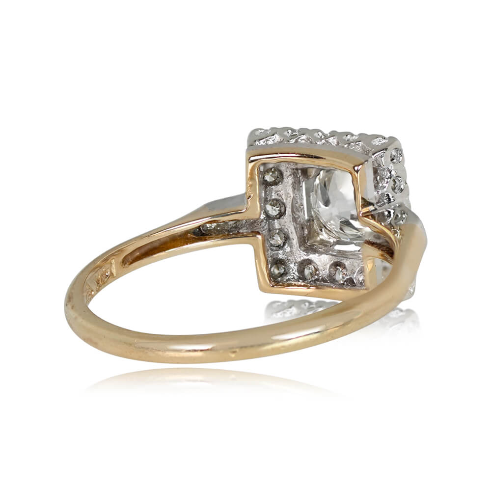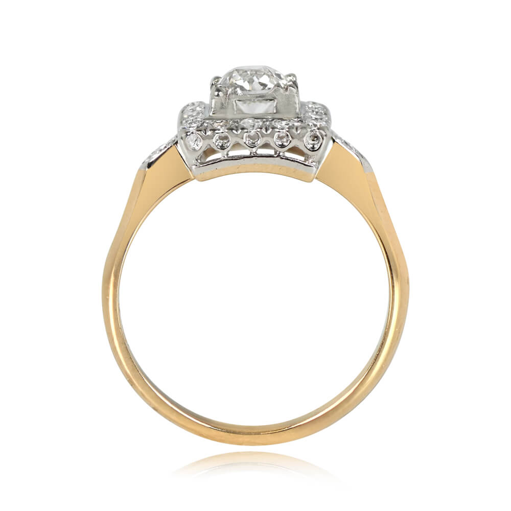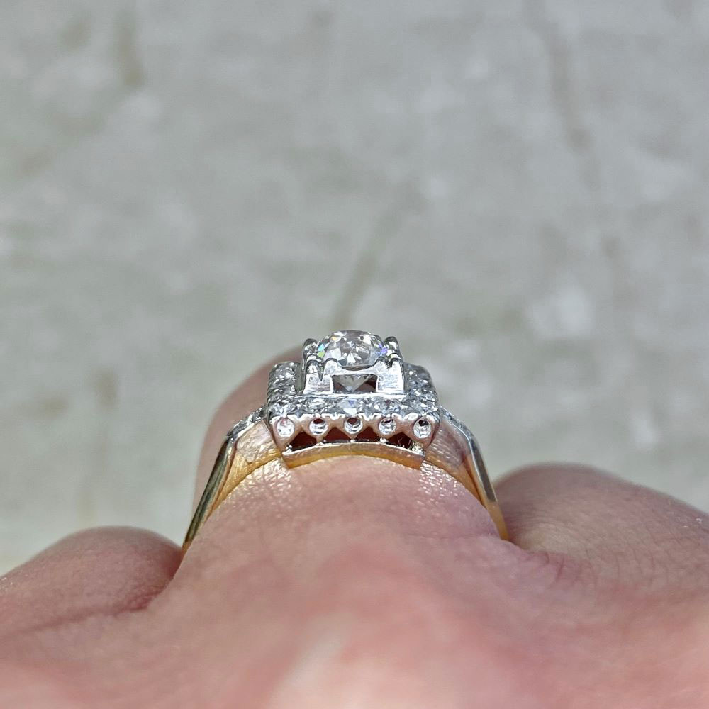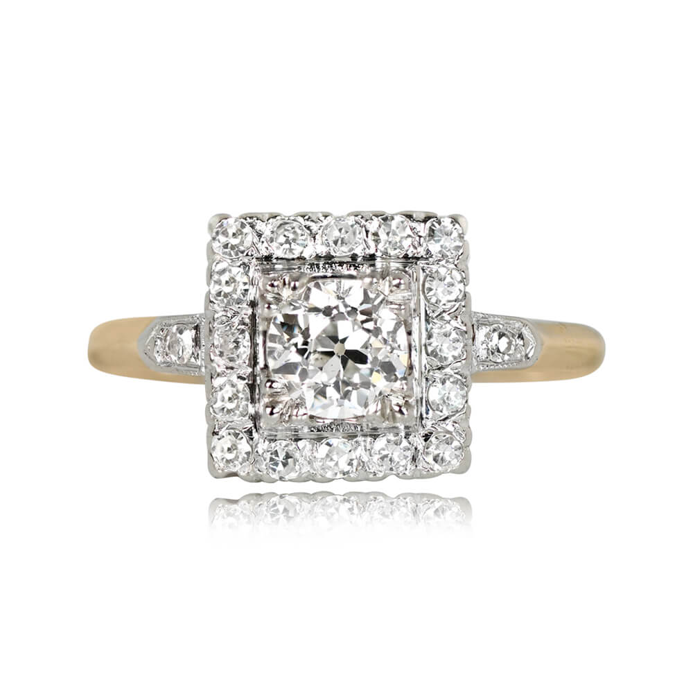 A vintage two-tone ring that features a 0.50 carat old European cut diamond, I color and SI1 clarity, set in box prongs. A halo of single cut diamonds accents the center stone, and an additional single cut is set on each shoulder. The mounting is 14k white gold on 14k yellow gold, and decorated with fine milgrain. This ring was handcrafted during the Retro era, circa 1940.