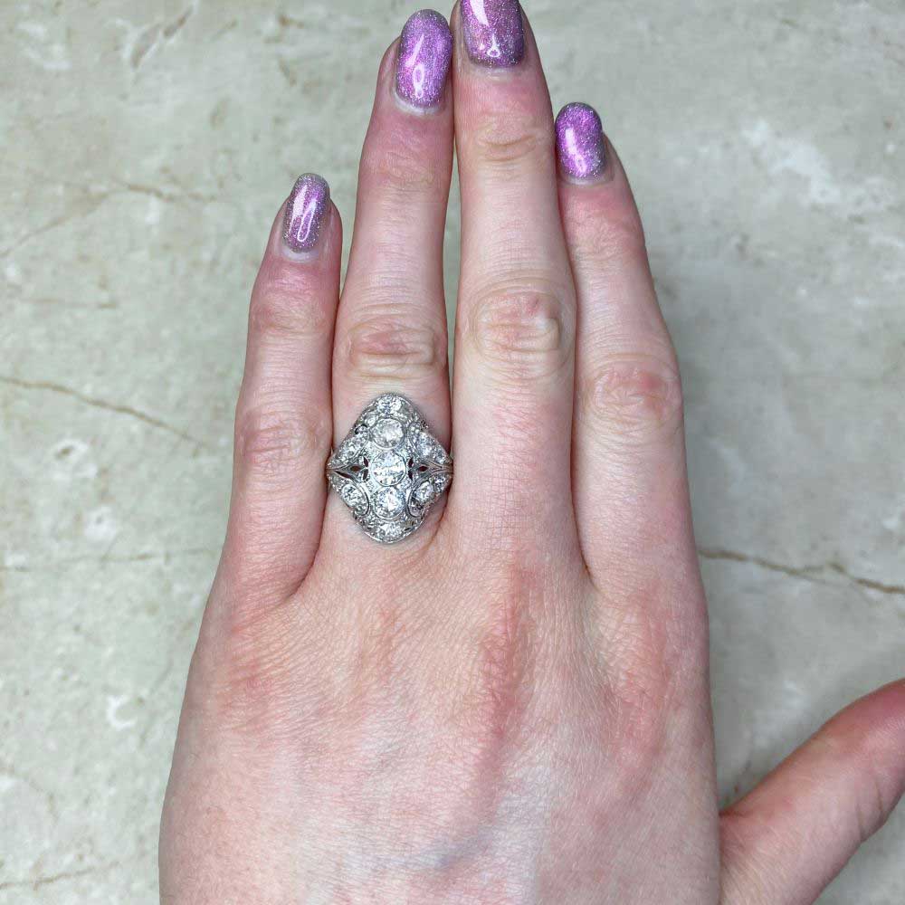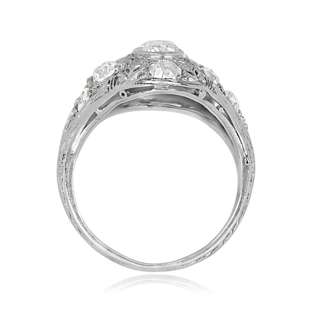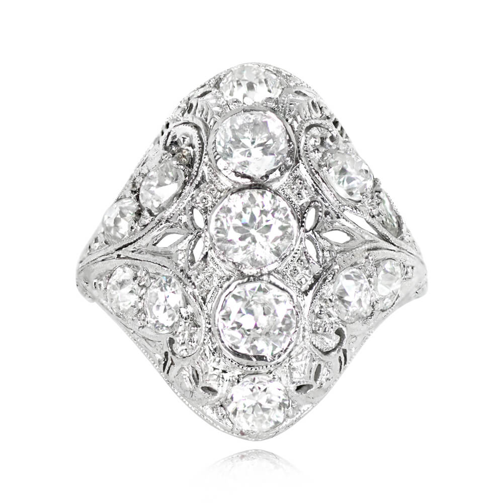 A elegant elongated antique ring that features three bezel-set old European cut diamonds, set north-south and weighing approximately 0.58 carats combined. The center stones are H-I color and SI1-SI2 clarity overall. The mounting is decorated with an openwork leaf-motif design and pave-set old European cut diamonds with a total weight of approximately 0.98 carats. Fine milgrain and hand-engravings further decorate the ring. This ring was handcrafted in platinum during the Art Deco era, circa 1920.