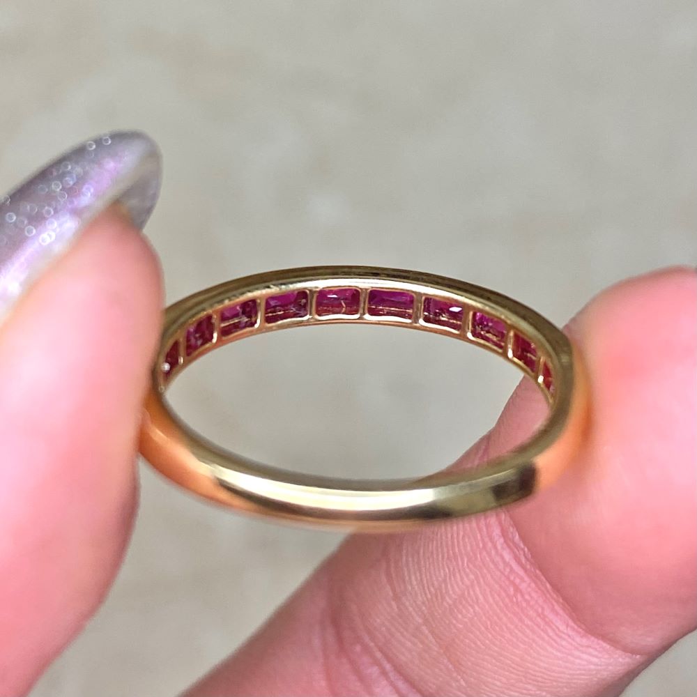 A half-eternity wedding band handcrafted in 18k yellow gold and set with natural rubies. The rubies are elongated French cuts and weigh 0.85 carats in total. The channel setting is accented by fine milgrain.