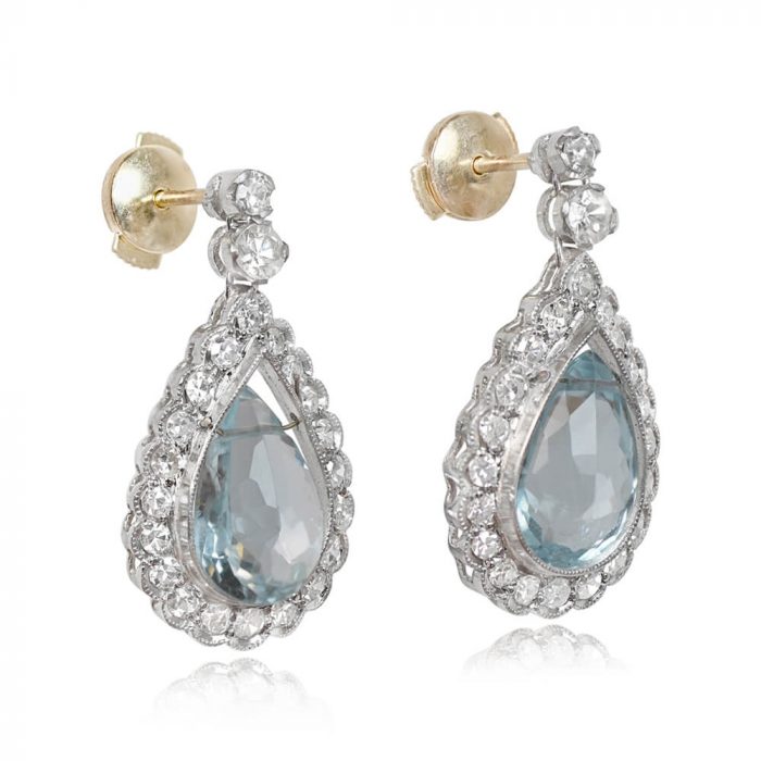 These earrings each feature a pear-shaped aquamarine weighing approximately 1.00 carat, surrounded by a halo of single cut diamonds set in half-bezels. Set at the top of each earring are two additional diamonds. Each earring has a diamond weight of approximately 0.48 carats. These earrings are platinum on 18k yellow gold.