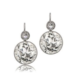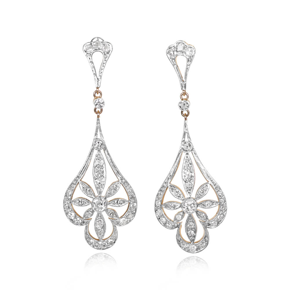 A pair of Edwardian-style dangling earrings centering two bezel-set transitional cut diamonds weighing approximately 0.12 carats each. The center stones are each surrounded by a floral design set with single cut diamonds. The total weight of the additional diamonds on each earring is approximately 0.47 carats. These earrings are platinum on 18k yellow gold.