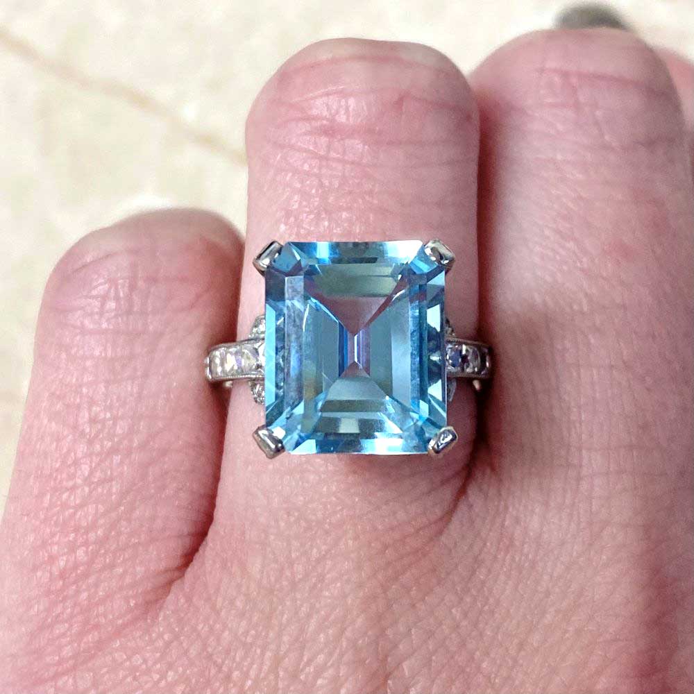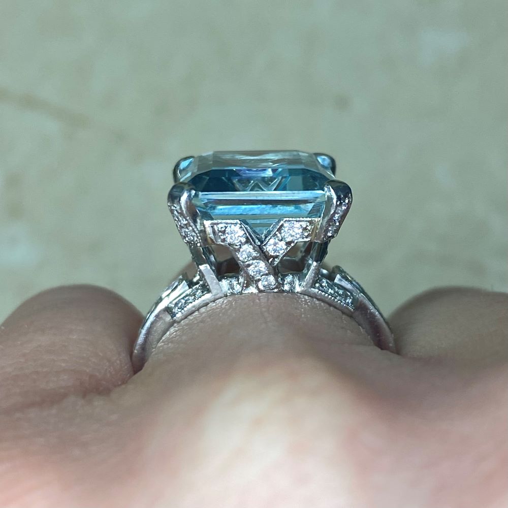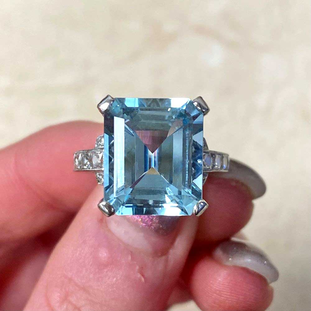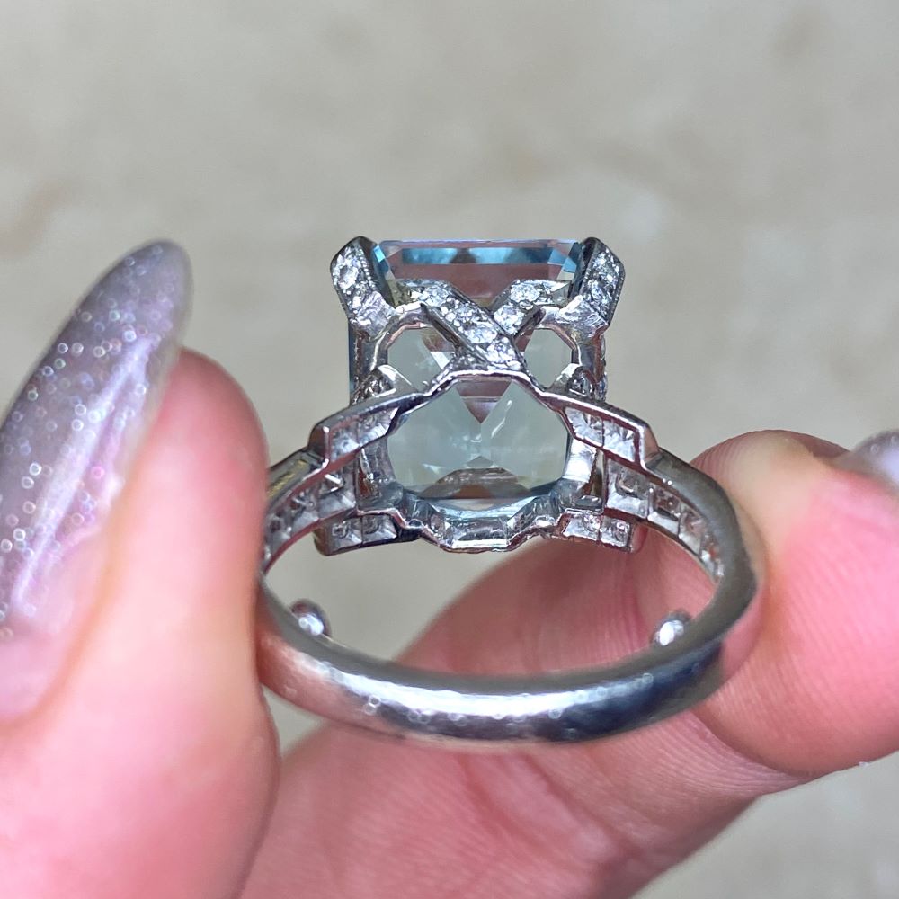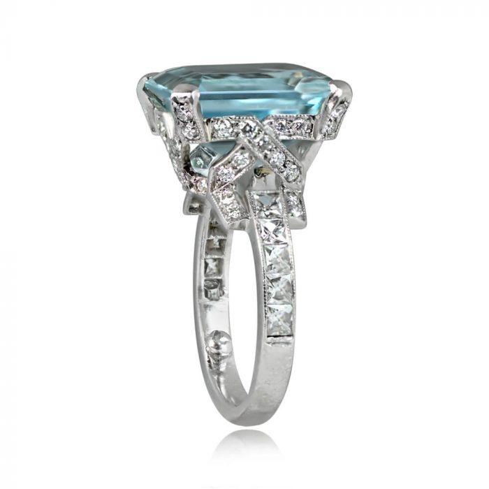 A gemstone ring featuring a 6.75 carat emerald cut aquamarine, set in prongs. The prongs and basket of this ring are set with round brilliant cut diamonds with a total weight of approximately 0.68 carats. French cut diamonds are set along the shank and weigh approximately 1.00 carat combined. This ring is handcrafted in platinum and decorated with fine milgrain.