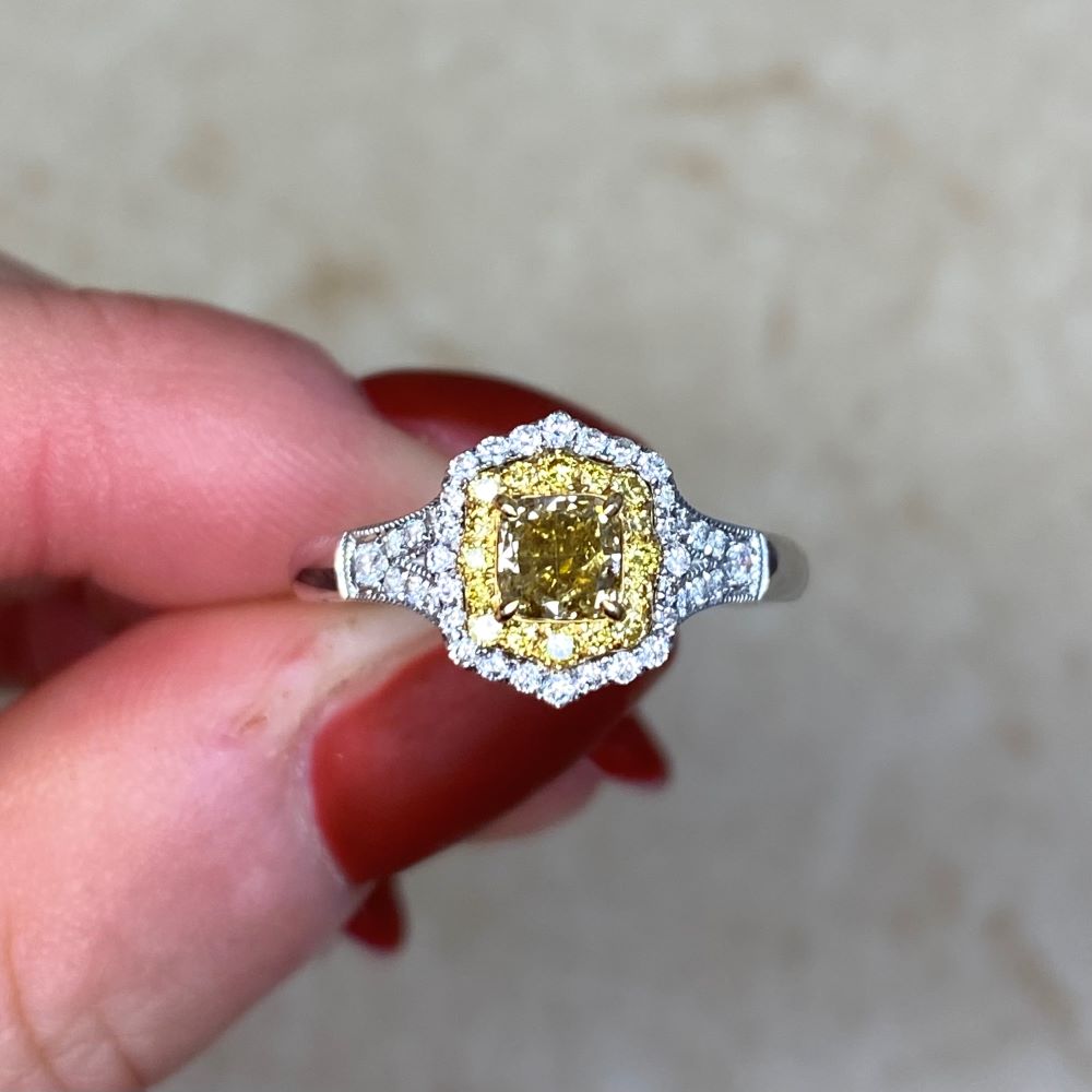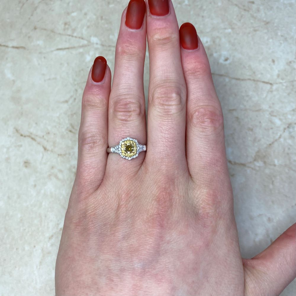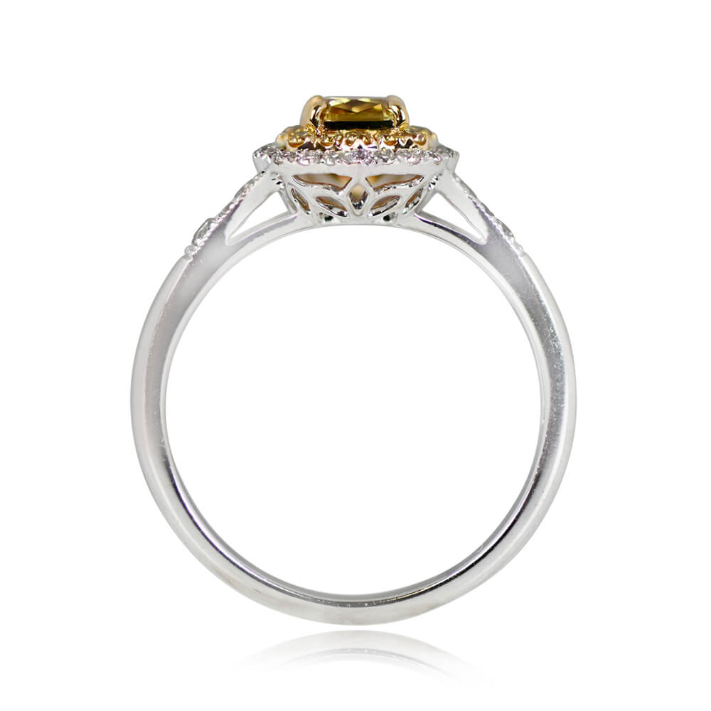 This ring features a 0.46 carat cushion cut yellow-brown diamond, SI2 clarity and set in prongs. The center stone is accented by a double halo of fancy yellow and white round brilliant cut diamonds. Additional round brilliants are set along the tapered shoulders. The total weight of the fancy yellow diamonds is approximately 0.16 carats. The total weight of the white diamonds is approximately 0.35 carats. The under-gallery is decorated with openwork. The mounting is 18k yellow and white gold.