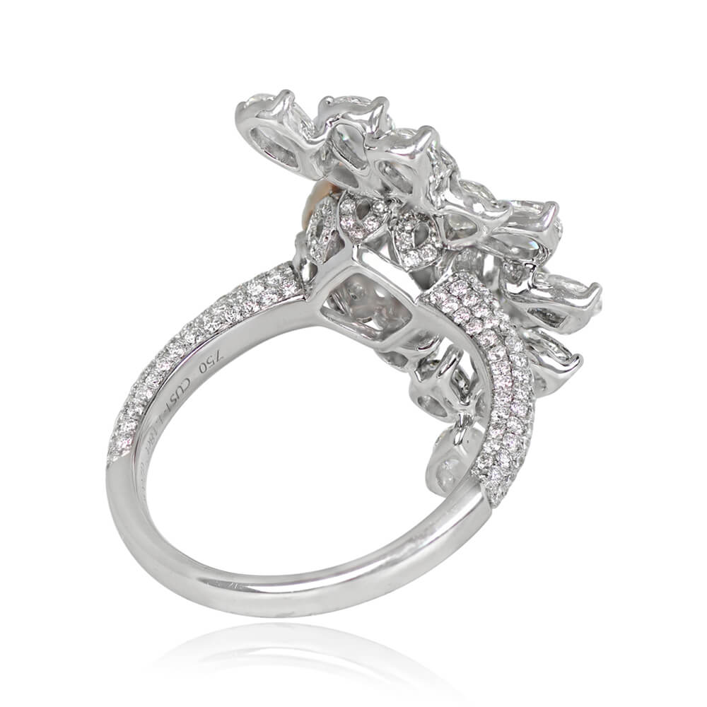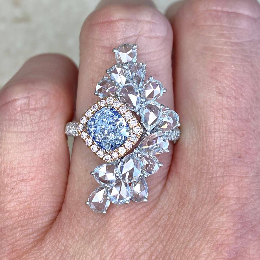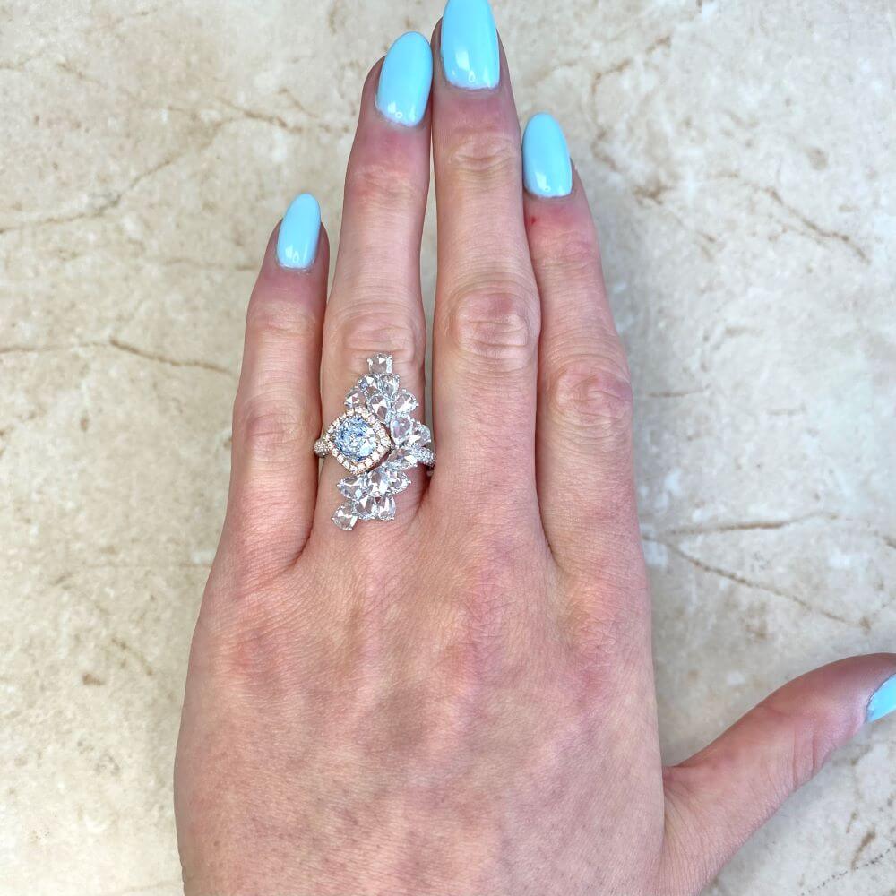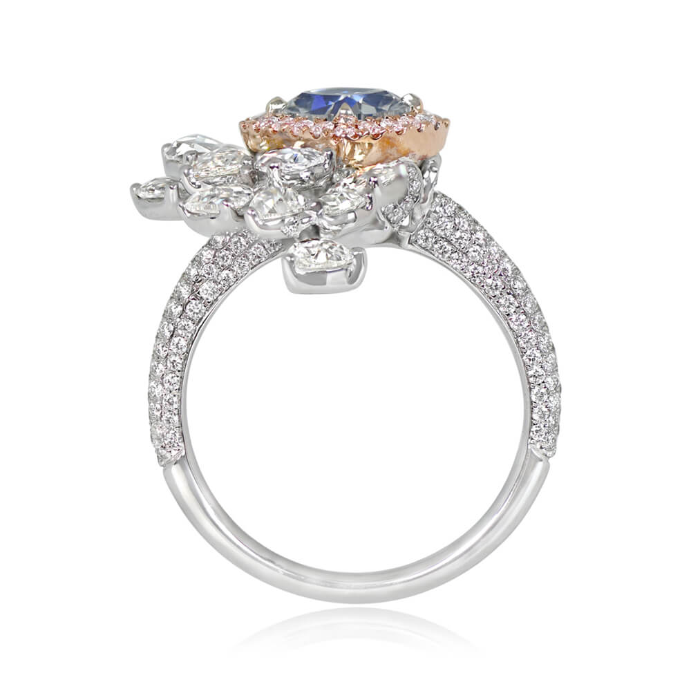 This ring features a 1.18 carat GIA-certified cushion cut Fancy Very Light Blue diamond, set in prongs and surrounded by a halo of round fancy pink diamonds. The fancy pink diamonds weigh 0.16 carats in total. An asymmetrical design of pear shape rose cut diamonds is set accenting the center stone, with a total diamond weight of 0.35 carats. Diamond-studded shoulders featuring multiple rows of micro-pave round brilliants lead past a geometric under-gallery decorated with additional round brilliant diamonds. The total weight of the round brilliant cuts is 0.55 carats. This ring is 18k rose gold on 18k white gold.