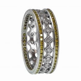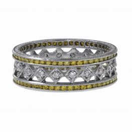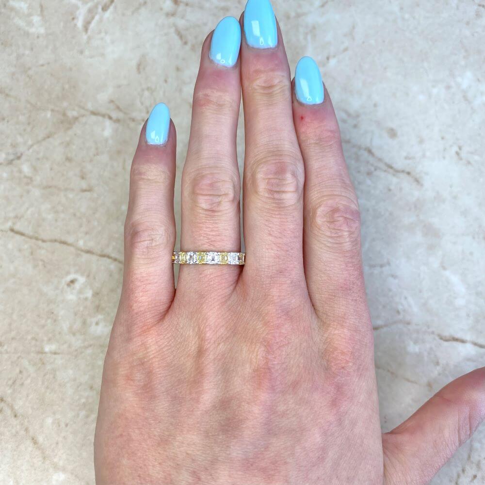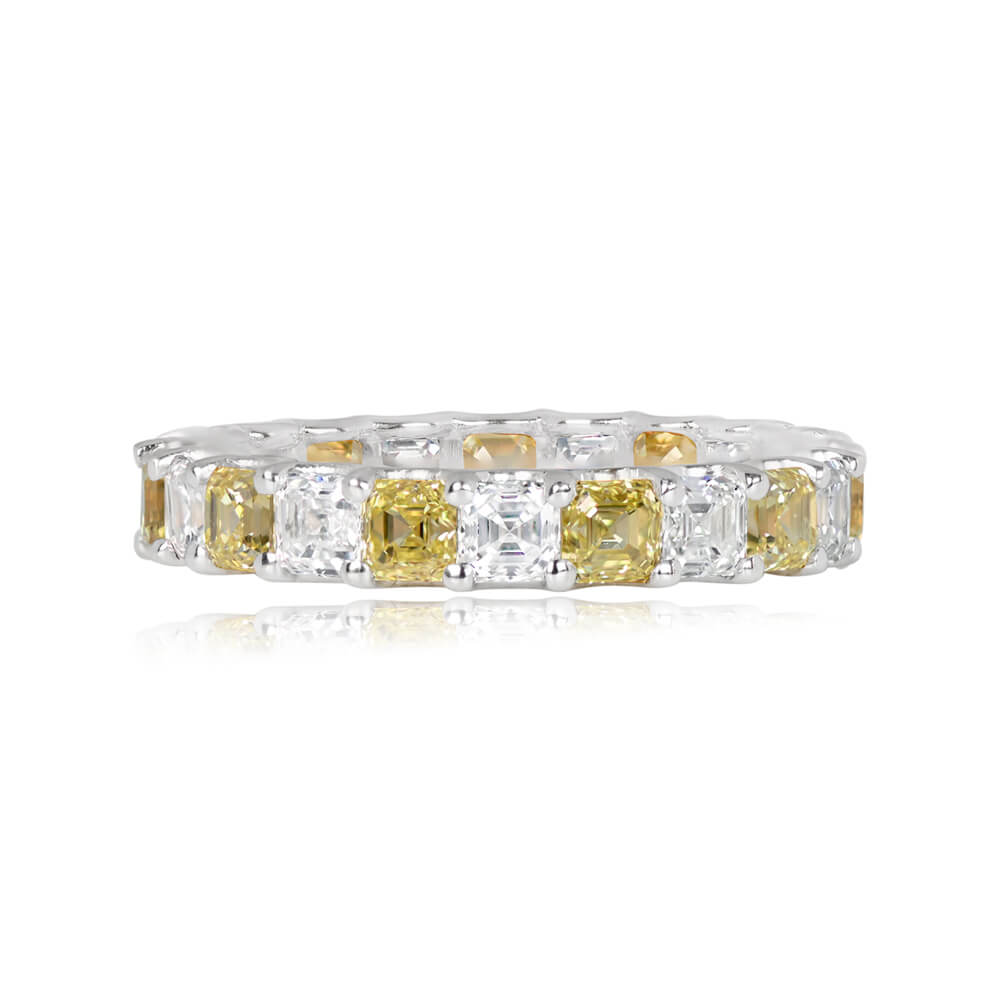 A diamond eternity band set with 3.60 carats total of Asscher cut diamonds. The band is set with eleven Fancy Vivid Yellow and eleven D-E color Asscher cuts, held by prongs in an alternating pattern. The Fancy Yellow diamonds are VS1 clarity, and the D-E color diamonds are VVS1. This band is 14k white gold.
