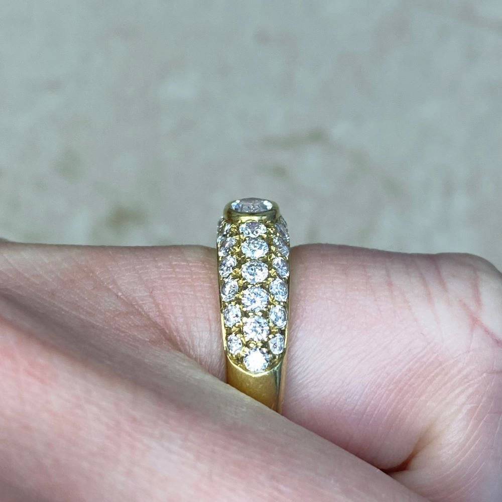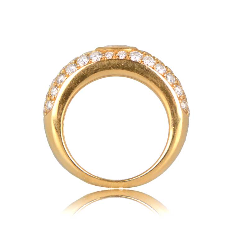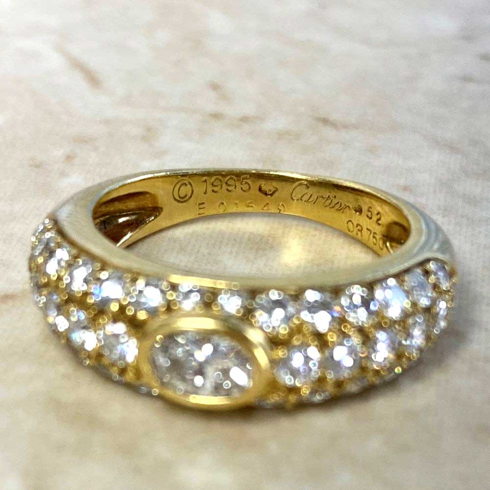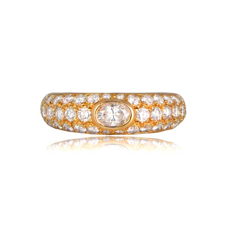 A vintage French Cartier engagement ring with a beautiful oval diamond weighing approximately 0.50 carats G color, VS1 clarity. Diamonds stud the top half of the yellow gold mounting.