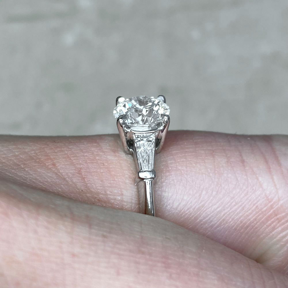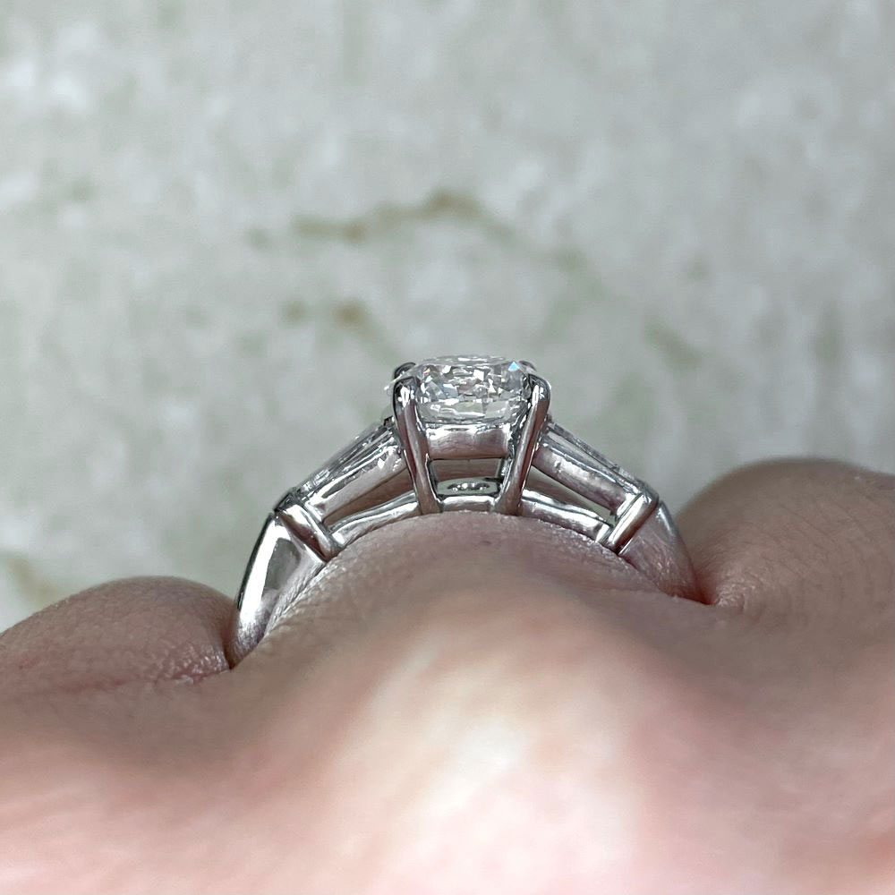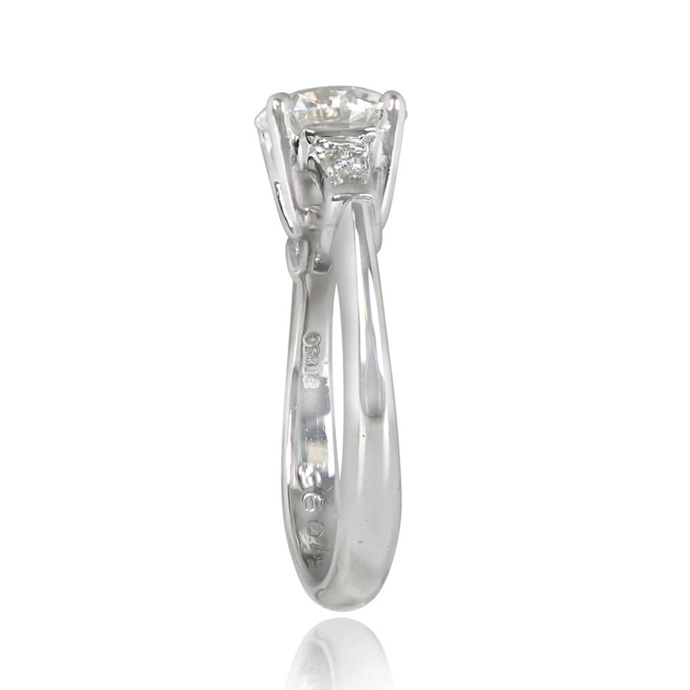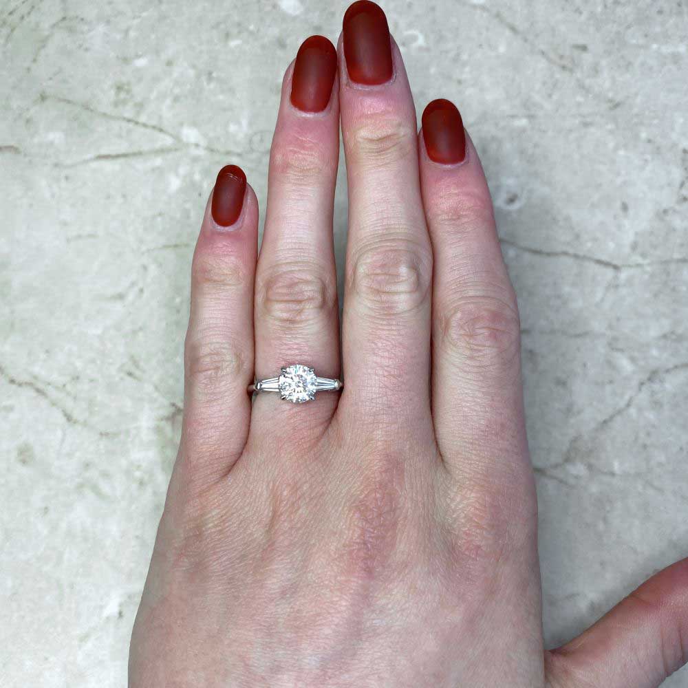 A gorgeous Tiffany engagement ring featuring a GIA-certified 1.29 carat round brilliant cut diamond, G color and VS1 clarity, set in prongs. Accenting the center stone are two tapered baguette cut diamonds set on the shoulders. The combined weight of the baguette cuts is approximately 0.36 carats. This ring is handcrafted in platinum and signed Tiffany & Co.