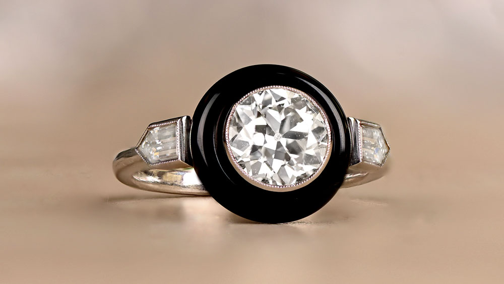 1.24 carat old European cut diamond and natural onyx halo engagement ring