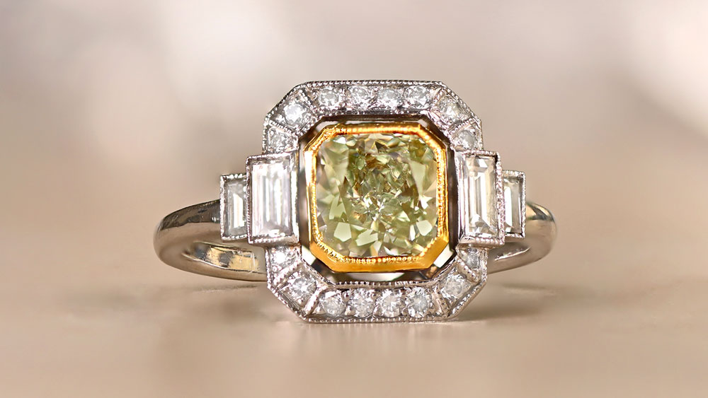 1.15 carat fancy yellowish green diamond and white diamond halo engagement ring.