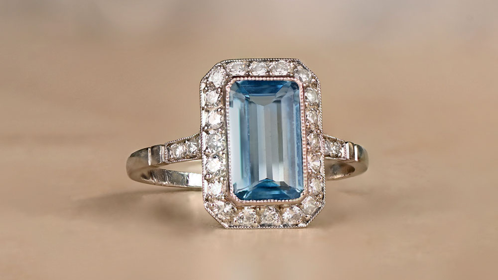 1.55 carat natural aquamarine and diamond halo gemstone ring
