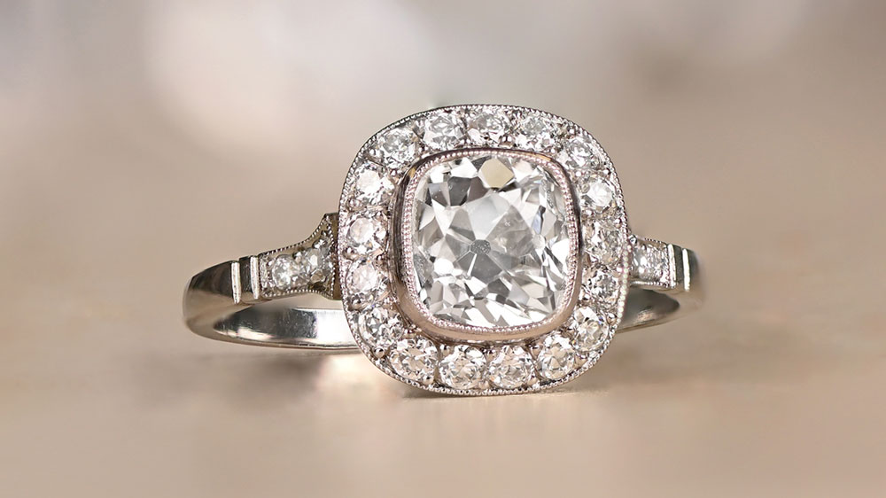 1.37 carat antique cushion cut diamond and halo platinum engagement ring