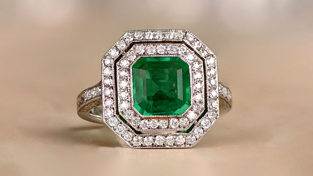 1.52 carat natural Columbian emeral d & diamond double halo platinum engagement ring.