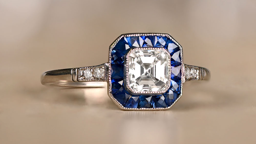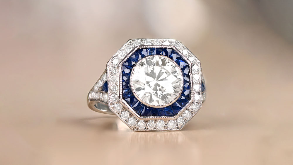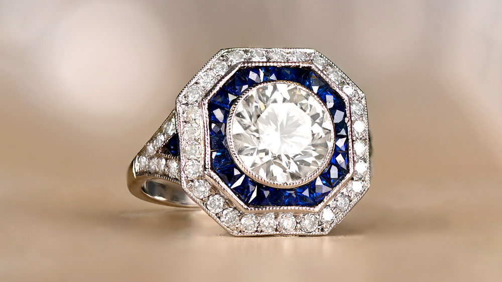 1.49 carat diamond and geometric sapphire halo engagement ring