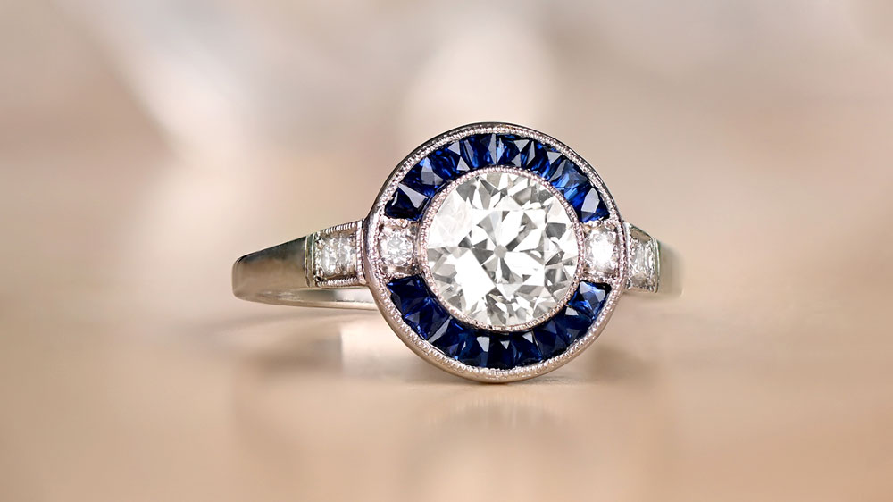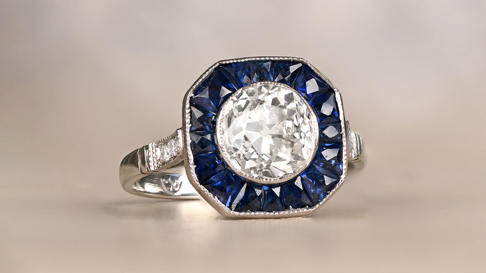 Lisbon Ring . Old European cut diamond and sapphire halo ring. Price $15,000.