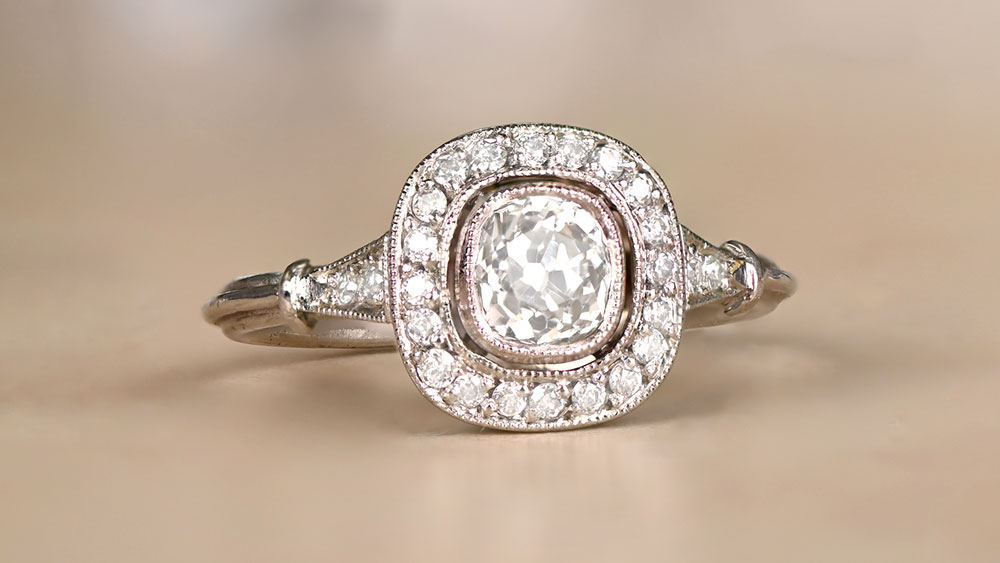 0.61 carat antique cushion cut and diamond halo platinum engagement ring.