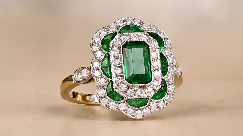 0.75ct natural emerald cut emerald and floral motif diamond halo gemstone ring.