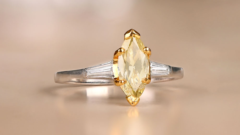 1.01 carat marquis cut fancy yellow diamond engagement ring.