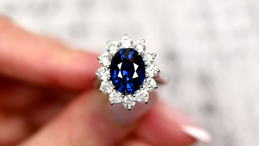 Wharton Ring . Natural oval sapphire weighing 5.99 carats, surrounded by diamonds.