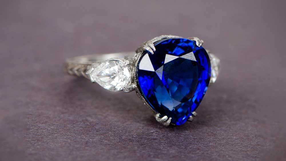 Another three-stone sapphire ring, but this time more remarkable. The pear-shaped center sapphire weighs nearly 10 carats. A hypnotizing piece, it is paired with two diamonds of half a carat each. The platinum band is engraved, paying tribute to the 1930s.