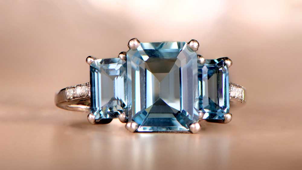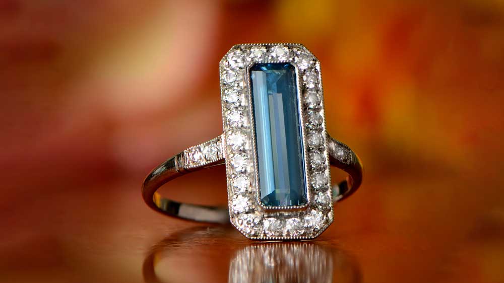 This ring will make your fingers look long and slender because of its elongated build. The emerald-cut aquamarine in the center sits within a diamond halo. The band is minimalistic, leaving the stones to bask in the limelight, and bringing a great example of what made the Art Deco Era so epic.