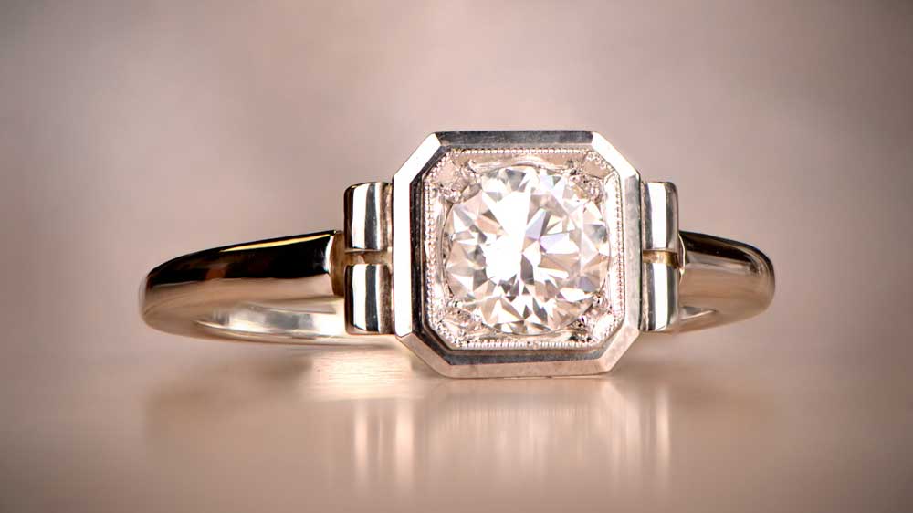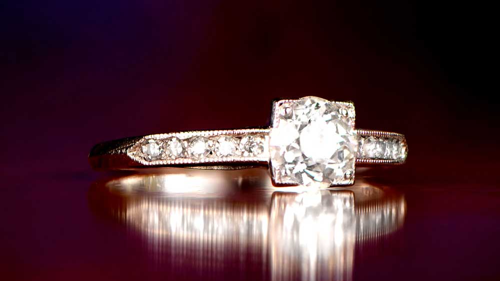 The setting of this Art Deco ring makes the old mine cut center stone appear square. A closer look reveals the beautiful, fine milgrain and openwork. More diamonds are located along the band, making the ring a vivid example of the Art Deco style.