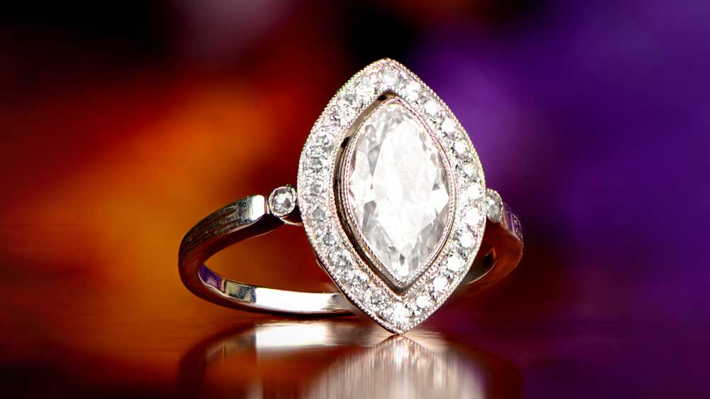 The Southwell ring is one of the most modest options in our selection. However, it is loaded with unexpected details. The platinum band holds five diamonds – an old European cut center stone, two marquise cut, and two single cut stones on the shoulders. The setting of the center diamond is a beautiful, high crown, which makes the stone appear square.