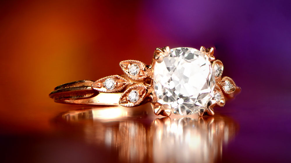 Square-shaped cushion cut rings offer strong competition to round pieces – just as timeless, but less common. A 1.92-carat diamond is in the spotlight, set in a halo of smaller stones. The under gallery is decorated in the best traditions of the Art Deco era.
