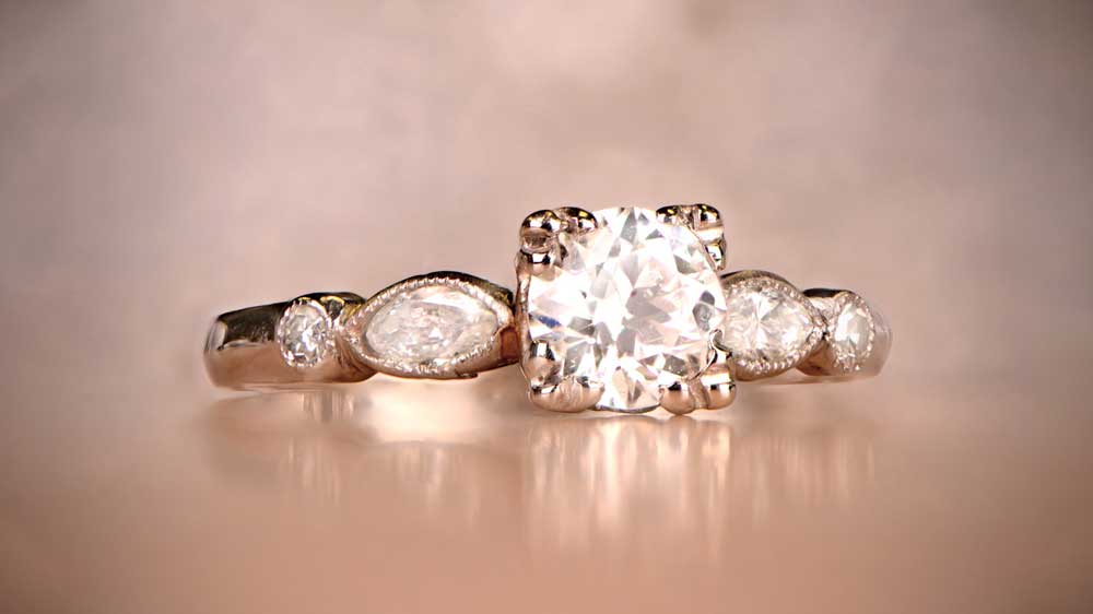 Vintage rings are hotter than ever! A classical, yet contemporary vintage diamond ring from the 1950s opens our selection. The center round cut stone of nearly a carat is paired with two baguette-cut diamonds. The three-stone ring style is a traditional choice, but different cuts give the ring a modern twist.