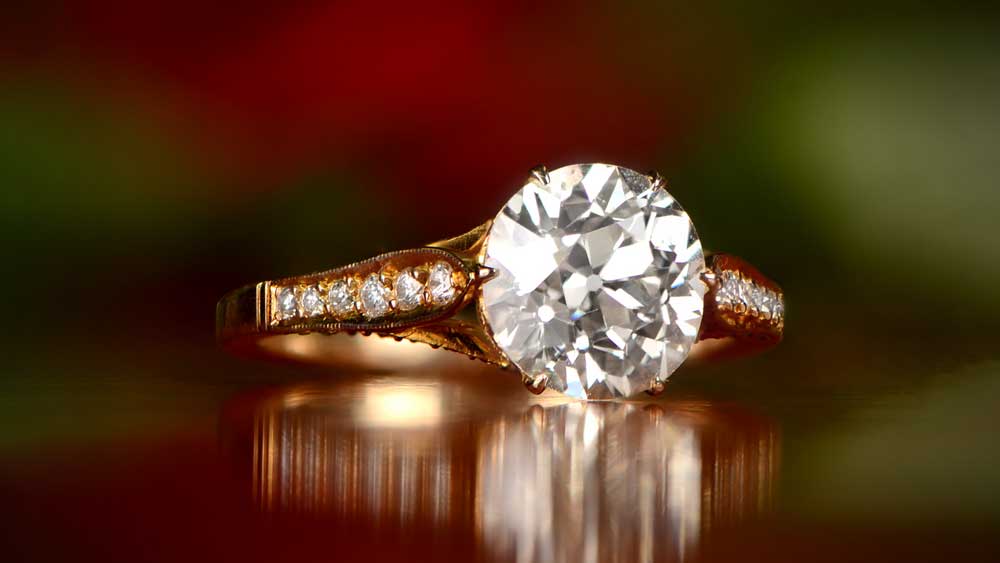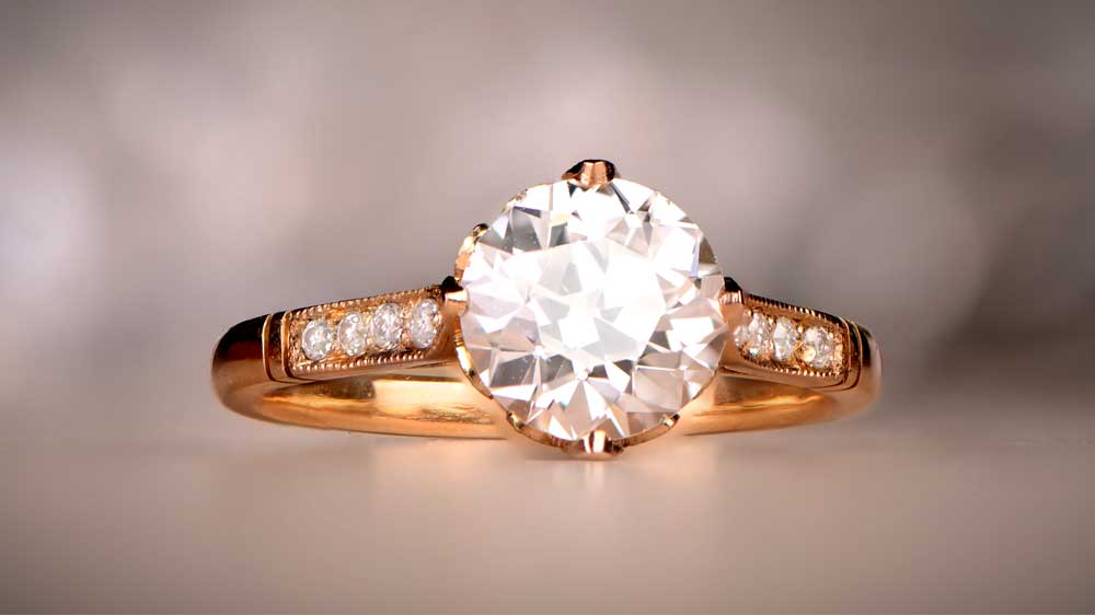 The rare yellow gold setting here is underestimated – diamonds contrast well with the warm tone, revealing bright, colorful rays. The ring features a nearly 2-carat old European cut diamond, crown detail on the under gallery, and a diamond pave on three sides of the band.