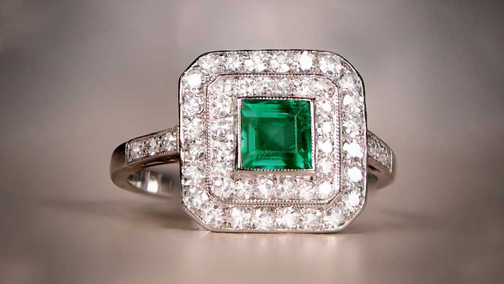 This is a double-halo style, Art Deco era ring. A genuine 0.6-carat emerald is in the spotlight here, surrounded by numerous diamonds, continuing on the ring’s shoulders. If you want to shine brighter than all stars in the sky combined, the Irvin Ring will become your ideal companion.
