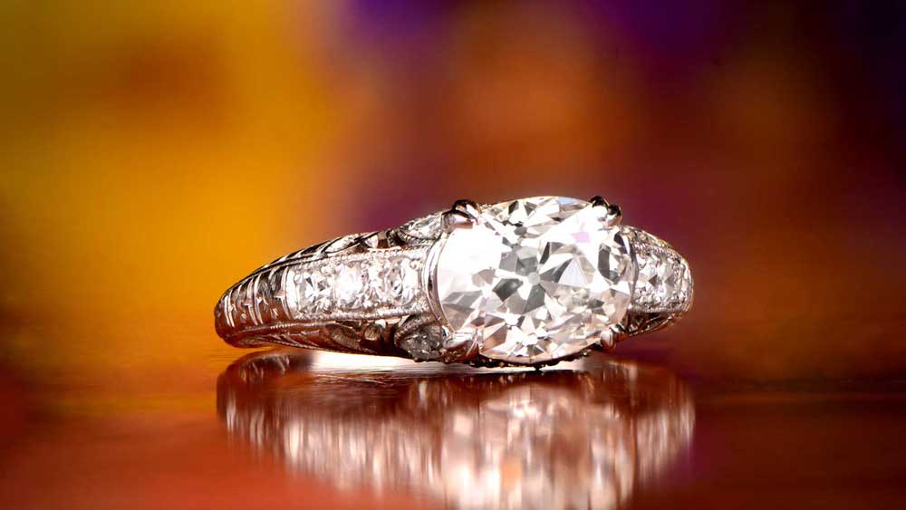 Back to the classics – this Art Deco ring features a notable 3.49-carat center diamond and a pave of smaller stones. The platinum band is elegantly decorated with ornamental filigree. The main stone is set in a high under-gallery, paying respect to the Art Deco era.