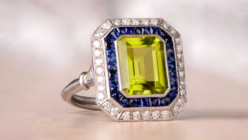 For the most creative brides, one color may not be enough. The Cald ring features a 3.17 carat, refreshingly-green peridot, surrounded by a sapphire halo and diamonds on the shoulders.
