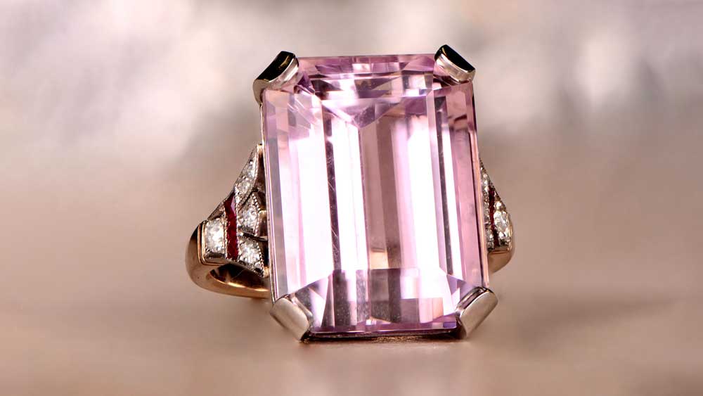 The final star and the largest stone of our selection. The Utopia ring features a gorgeous 16.4-carat pink kunzite, paired with tiny (especially compared to the center stone!) diamonds and rubies. The rose gold setting makes the ring even more trendy. A ring like this will certainly make you feel like you’re living in a paradise, or so we think.