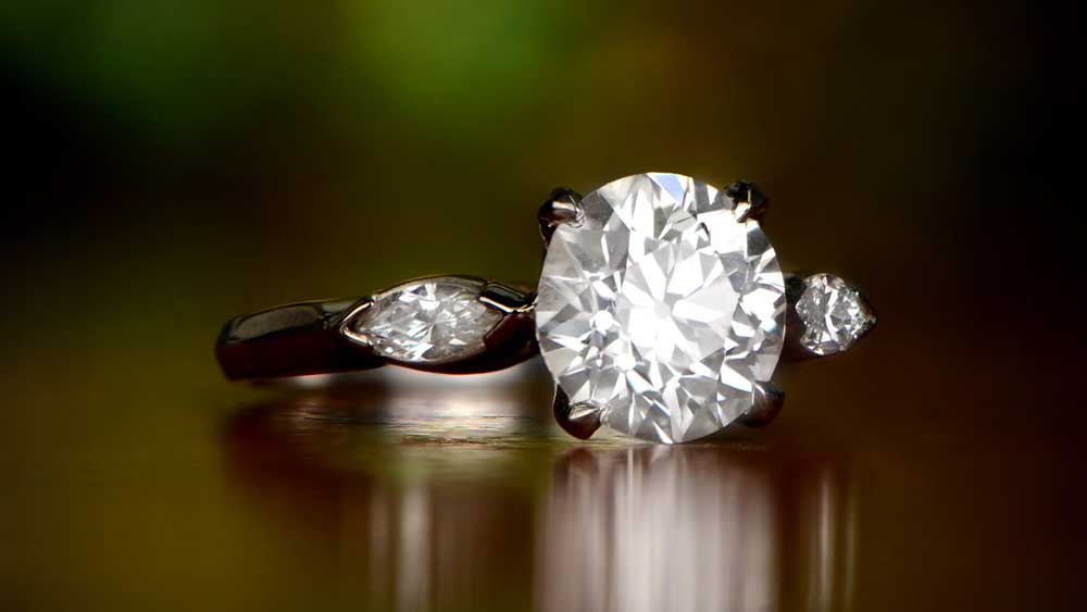 A three-stone diamond ring – what could be more timeless? This style symbolizes the past, present, and future. The center 2.05-carat stone is round cut and certified as D color grade, which is considered rare, because of how few D-color diamonds there are. It is paired with two marquise-cut diamonds, that add a modern touch to the ring.