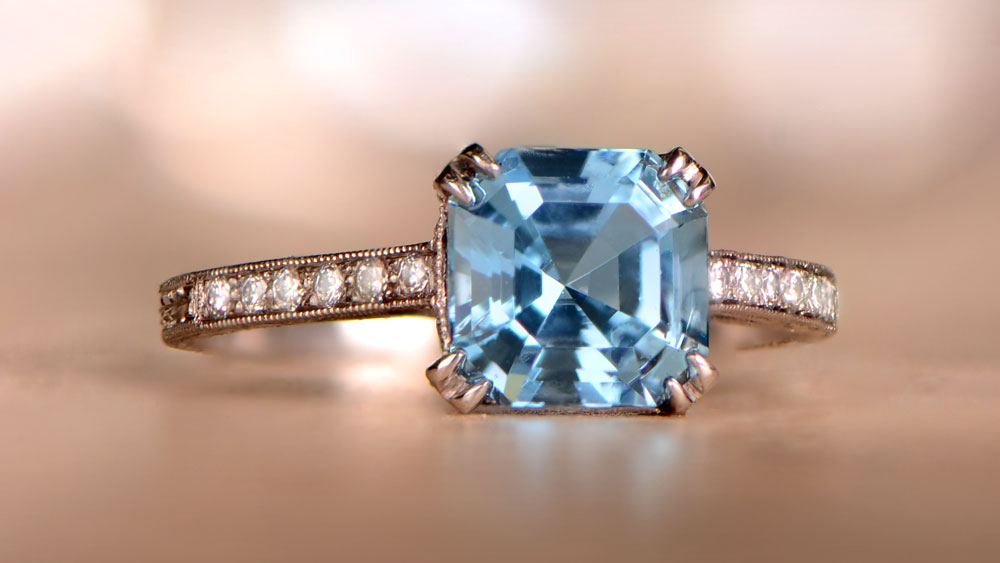 This celestial Asscher Cut Aquamarine Ring of a heavenly blue color evokes peace, hope, and deep, subtle feelings. The platinum band is engraved and features a diamond pave, resembling elvish treasure.