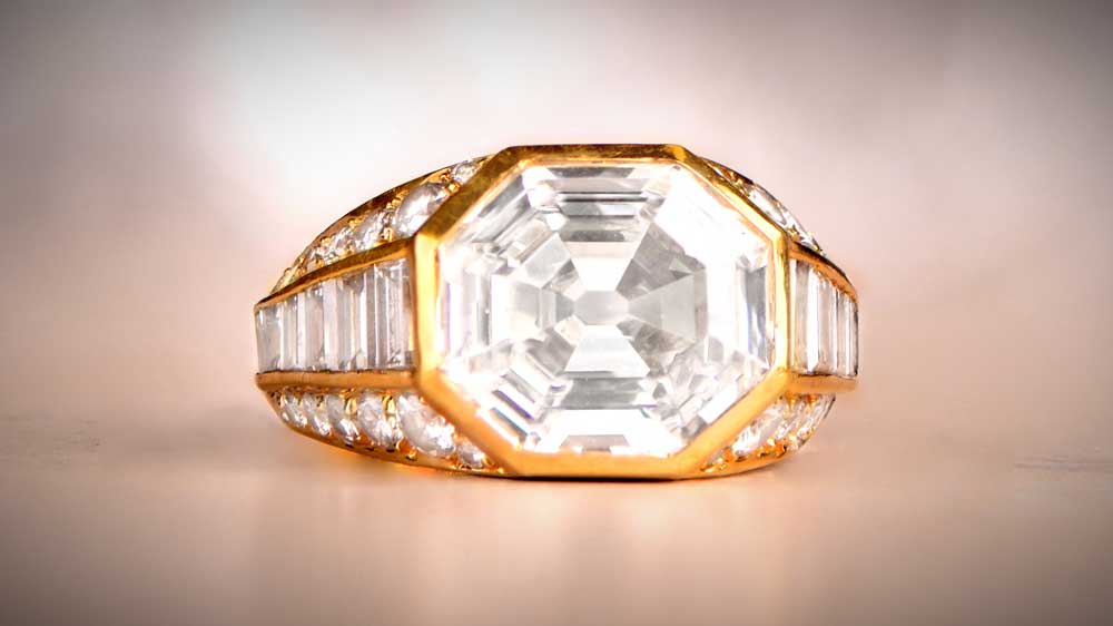 The unique design of this Bulgari ring from the 60s’ has the true wow-factor. The center Asscher cut diamond weighs over 5 carats, with a large number of round and baguette-cut diamonds on the shoulders. With such an extravagant ring, you won’t remain unnoticed.