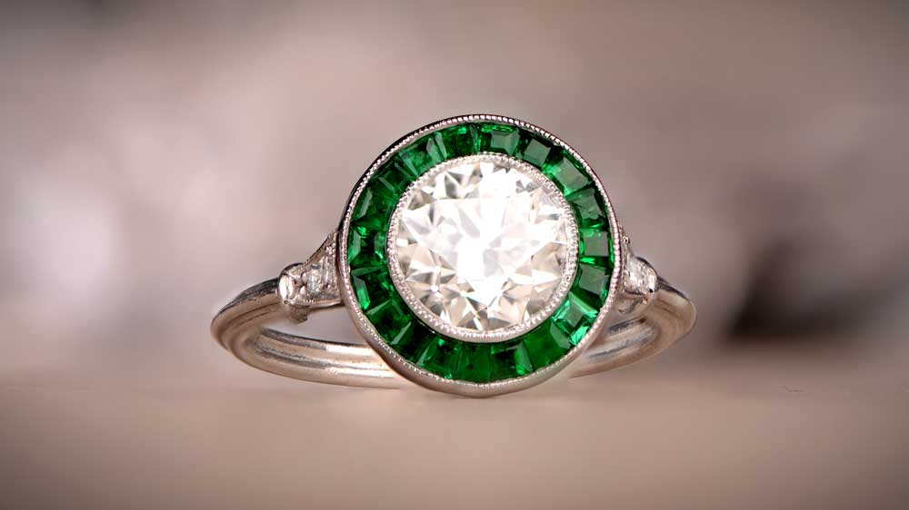 If you fancy the bright halo of the Albury ring but prefer more minimalistic designs, the Auburndale ring is a great alternative. The 1.16-carat, old European cut center diamond, and French-cut emeralds are set in a floral openwork gallery. The main stone dates back to the 1920’s, while the mounting is modern, inspired by the Art Deco style.