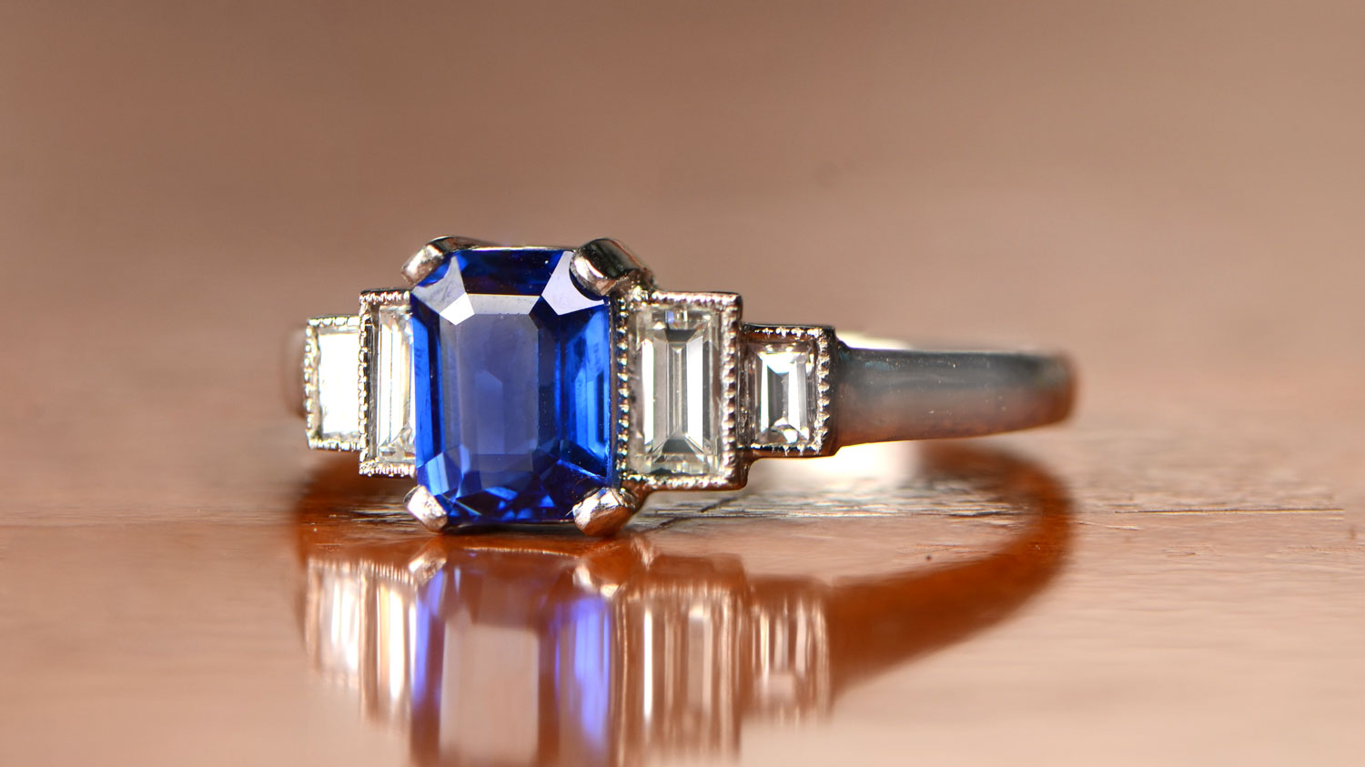 Sapphires are an elegant alternative to diamonds and a choice of the Royal family. The Atlantic ring introduces a square cut, 1.5-carat genuine sapphire, with two baguette-cut diamonds on the shoulders.