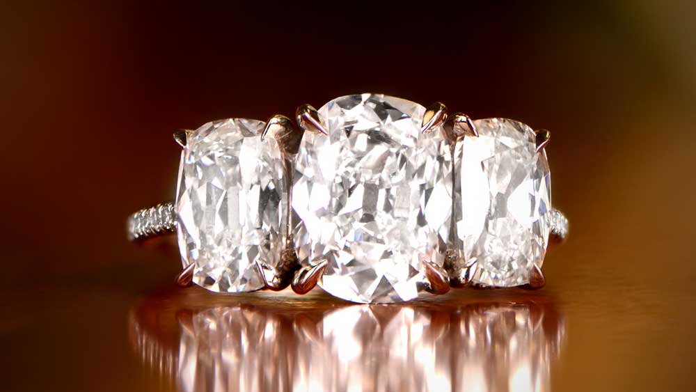 Three-stone rings are a traditional choice, but this doesn’t mean they have to be modest. If you agree that three large diamonds are better than one, you will like the Westchester ring. The main stones weigh over 4 carats in total. And if that’s not enough, the ring’s band is encrusted with more diamonds.
